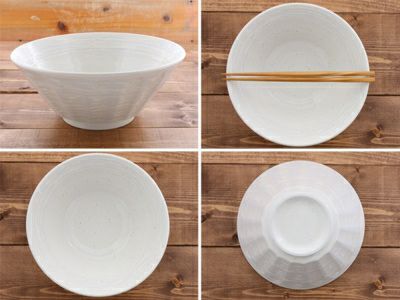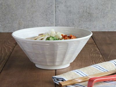 外側をストライプ状に削った「しのぎ」という技法を用いた、「しのぎ刷毛目」シリーズの6.8寸ラーメンどんぶりです。 こちらのラーメン鉢は、大きめですので、麺1玉では足りないという男性や、スープやトッピングもたっぷりほしいという方にオススメのサイズ。 もちろん、うどん丼ぶりや、そばどんぶりなど、麺鉢にもどうぞ。 温かみのある粉引は和食器の中でも人気。どんなメニューにも合わせやすい色合いです。 スッキリした台形型のフォルムは盛り付けがおしゃれにできるため好評です。