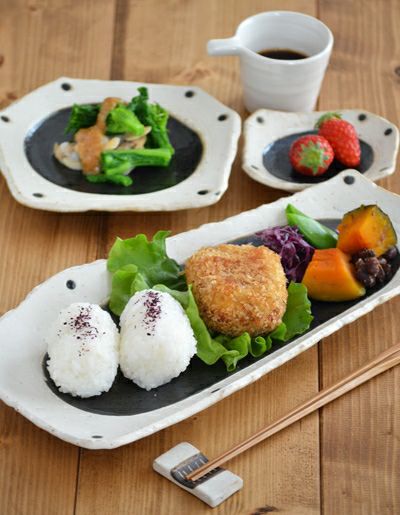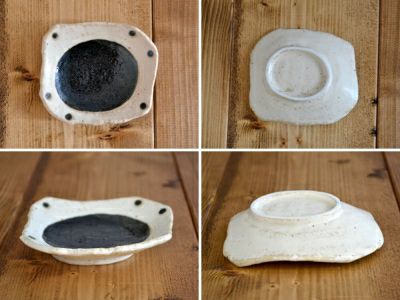 こちらは丸でも四角でもない変形型の器。 ざっくりとした造りながら温かく表情があり、味わい深い雰囲気。 盛り付け部分の黒が食材の色を引き立て、なお食卓も引き締めます。 野菜の色が綺麗に映えるので、野菜たっぷりのメニューを盛り付けるととっても綺麗です。 こちらはお醤油皿の他、お漬物やちょこっとフルーツを乗せたりお菓子を乗せる、といった使い方に。