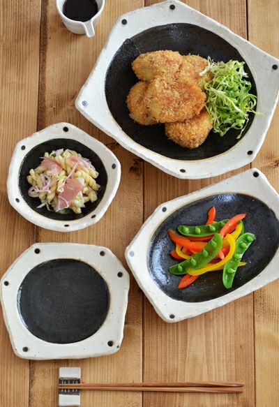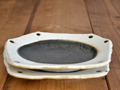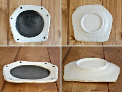 こちらは丸でも四角でもない変形型の器。 ざっくりとした造りながら温かく表情があり、味わい深い雰囲気。 盛り付け部分の黒が食材の色を引き立て、なお食卓も引き締めます。 野菜の色が綺麗に映えるので、野菜たっぷりのメニューを盛り付けるととっても綺麗です。 こちらは取り皿としてや、ちょこっと和え物などの副菜を乗せたりお菓子皿としても可愛らしく使えます。