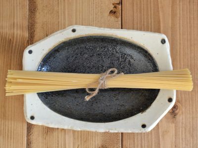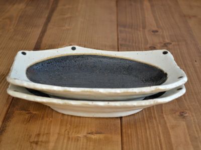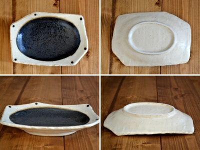 こちらは丸でも四角でもない変形型の器。 ざっくりとした造りながら温かく表情があり、味わい深い雰囲気。 盛り付け部分の黒が食材の色を引き立て、なお食卓も引き締めます。 野菜の色が綺麗に映えるので、野菜たっぷりのメニューを盛り付けるととっても綺麗です。 こちらは一人分の煮物やサラダ、お刺身や和物などの盛り付けに。