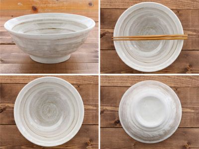 和の趣たっぷりのラーメン丼ぶり。 粉引の白い生地に、大胆な茶の刷毛目が入っている落ち着いたデザイン。どんなメニューにもしっくり似合う色合いが嬉しいポイント。 外側の素地をわざと凸凹とさせ、器の表情を楽しめる和食器です。 ラーメン鉢以外にもう、どんなどの麺鉢としてはもちろん、煮物やサラダの盛り鉢にもどうぞ。 こちらは少し大きめの6.8寸サイズ。スープやトッピングもたっぷりがいい!という方にオススメのどんぶり。
