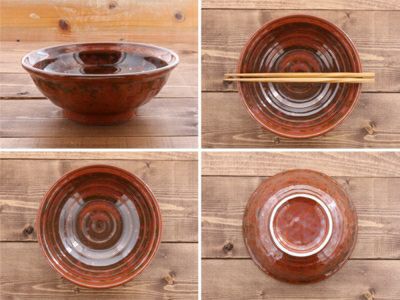 和の趣たっぷりのラーメン丼ぶり。 鉄の入った釉薬(ゆうやく)で、光沢のある朱色に近い赤と、斑に入ったシルバーのような色が印象的な風合いで、麺や具材も引き立ちます。 外側の素地をわざと凸凹とさせ、器の表情を楽しめる和食器です。 ラーメン鉢以外にも、うどんなどの麺鉢としてはもちろん、煮物やサラダの盛り鉢にもどうぞ。 こちらはご家庭で使いやすい定番の大きさ、6.3寸サイズです。