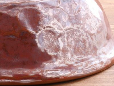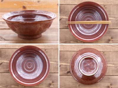 和の趣たっぷりのラーメン丼ぶり。 鉄の入った釉薬(ゆうやく)で、光沢のある朱色に近い赤と、斑に入ったシルバーのような色が印象的な風合いで、麺や具材も引き立ちます。 外側の素地をわざと凸凹とさせ、器の表情を楽しめる和食器です。 ラーメン鉢以外にもう、どんなどの麺鉢としてはもちろん、煮物やサラダの盛り鉢にもどうぞ。 こちらは少し大きめの6.8寸サイズ。スープやトッピングもたっぷりがいい!という方にオススメのどんぶり。