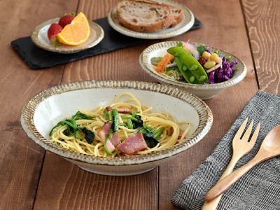 大人気の「渕錆粉引」シリーズの楕円鉢。なめらかな粉引きの素地が温かみを感じさせ、渕のストライプ のような鎬に錆色の釉薬をかけることにより、 引き締まった 印象にしてくれる食器です。 こちらは一人分のパスタやご飯物の丼ぶりとして。煮物など、毎日のおかずもOK!気軽にカフェ風を楽しめます。