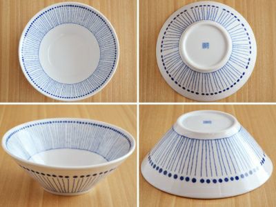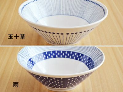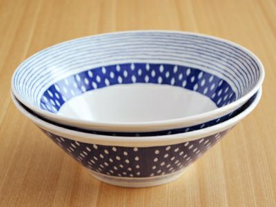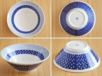 ブルーのモダンな模様のお皿。現代的な雰囲気ながら、それぞれの柄は和食器の伝統的な文様が使われており、食卓を爽やかに彩ってくれます。 こちらの台形ボウルは、下に向かってシュッとすぼまった形をしているのがお洒落な印象。 ラーメンなどの麺や、具をタップリのせた丼料理にオススメです。