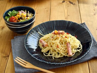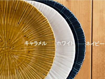 彫十草模様に、落ち着きのある3色を合わせた大皿。 定番のホワイトに加え、ネイビーとキャラメルはカラープレートながらも深みのあるカラーで、うるさ過ぎず、現代的なテーブルコーディネートをお楽しみいただけます。 和洋問わずマッチするので、毎日大活躍間違いなしの1枚です。 パンやサラダを乗せて朝食やランチのワンプレートに。もちろん、パスタ皿としてや、メインディッシュのおかずを乗せるのにもぴったりですよ。