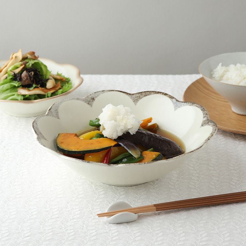和・洋問わず使える花形の大鉢です。 大鉢はおかずの盛り鉢、サラダボウルなど、多用途に使えます。深皿ですので汁物や汁気のある料理もOK。 家族での食卓に用いたり、おもてなし・パーティーシーンでも活躍する大きいボウルです。 普段使いからおもてなしまで幅広いシーンで大活躍。