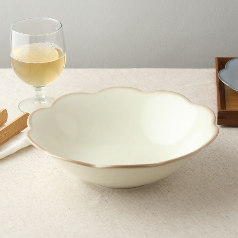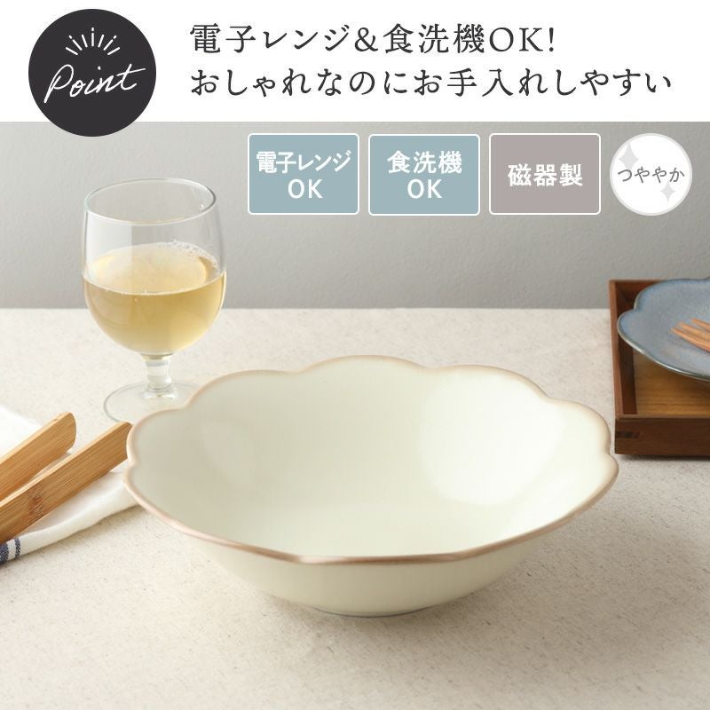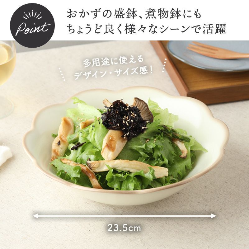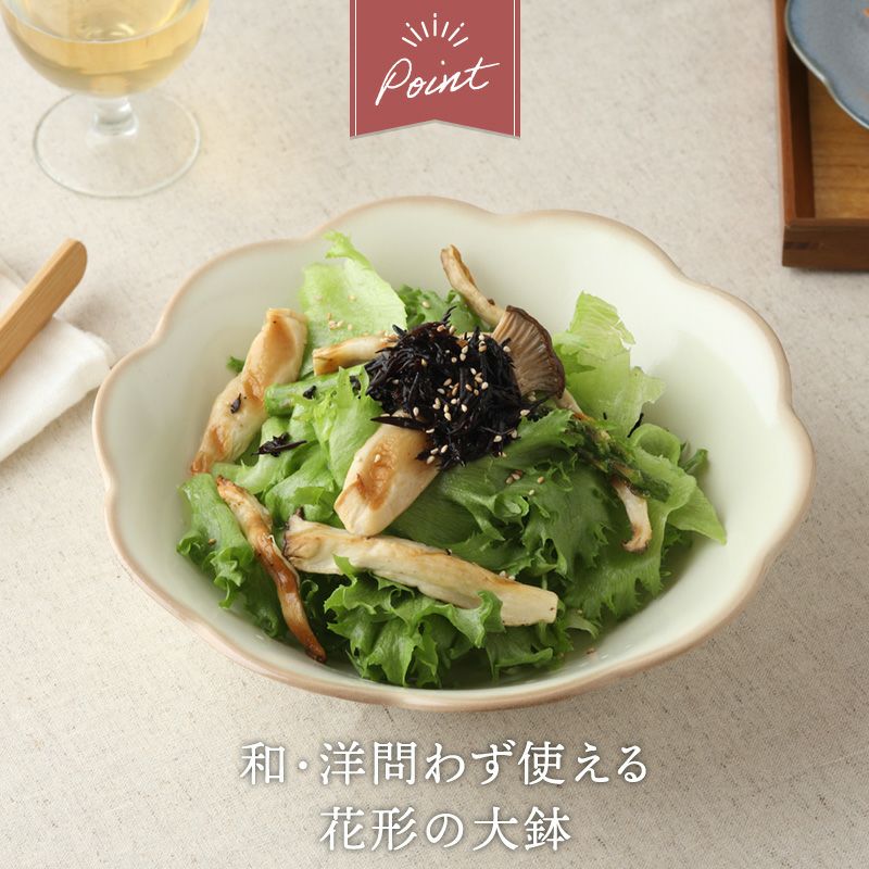 お花の形が華やかに食卓を演出してくれる大鉢。 メインディッシュ、盛鉢にもちょうど良く様々なシーンで活躍間違いなしです! 深さがあるので煮物や具材たっぷりなサラダにぴったりです。 メイン料理だけでなくスープパスタやフルーツを盛るテーブルボウルとしても◎