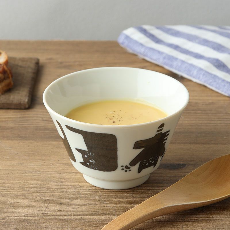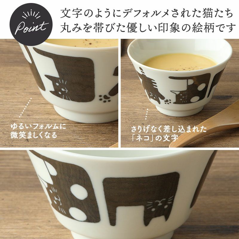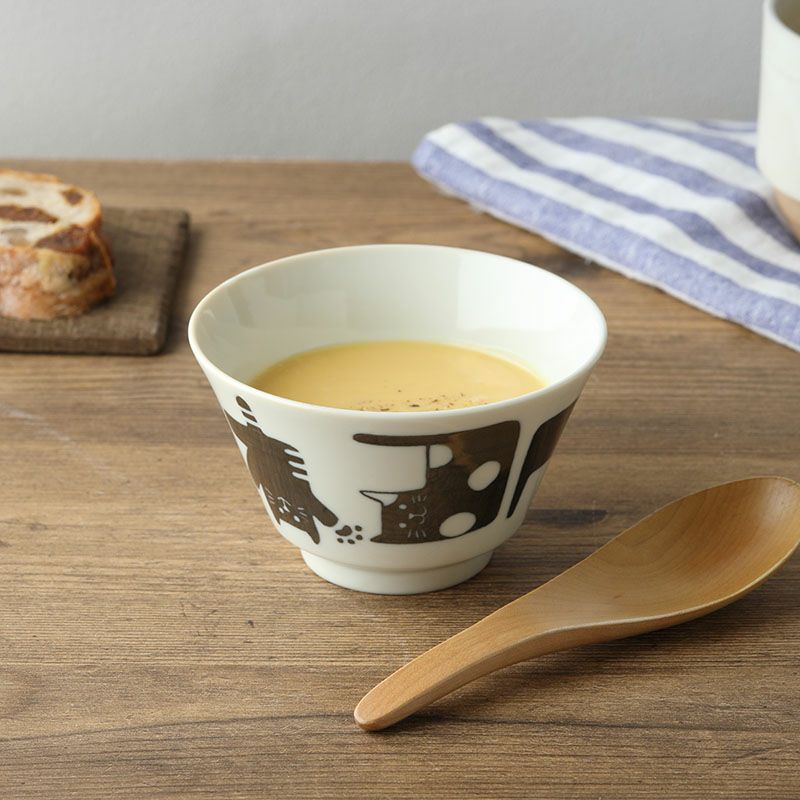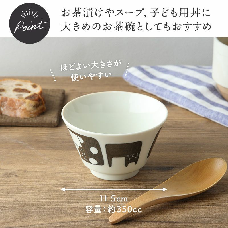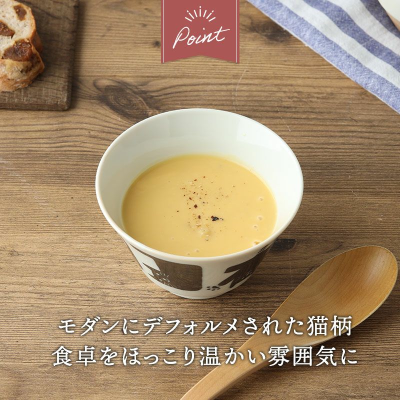 かわいい猫柄の小さめどんぶり。 ミニ丼やお子様用どんぶりとして、スープボウルや大きめのお茶碗としてもお使いいただけます。 素朴で温かみを感じさせる、猫好きの方にはたまらないデザインです。 毎日の食卓にほっこりした気分を運んでくれます。