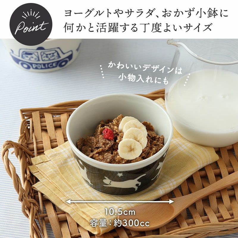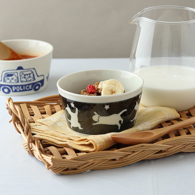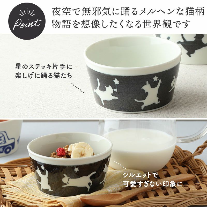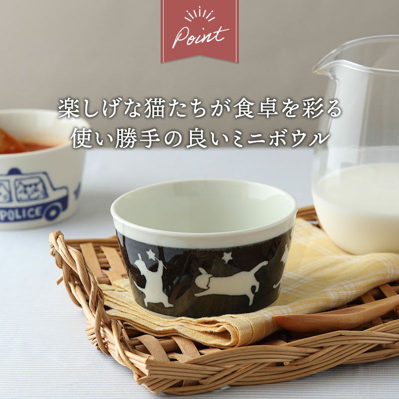 踊る猫のシルエットがとっても可愛い器で食事も楽しくなります。 小鉢はサラダボウル、おかず小鉢、デザートボウル、アイスカップ、ヨーグルトボウル、スープカップなど多用途に使え、家庭には必須のサイズ。 いくつあっても困りません。残り物のおかず、お鍋の取り鉢のとんすいとしても使えますよ。 可愛い小鉢なので小物入れなどのインテリアカップとして飾るのもオススメです。