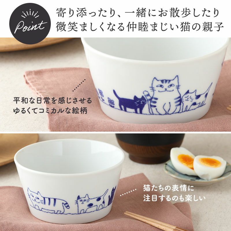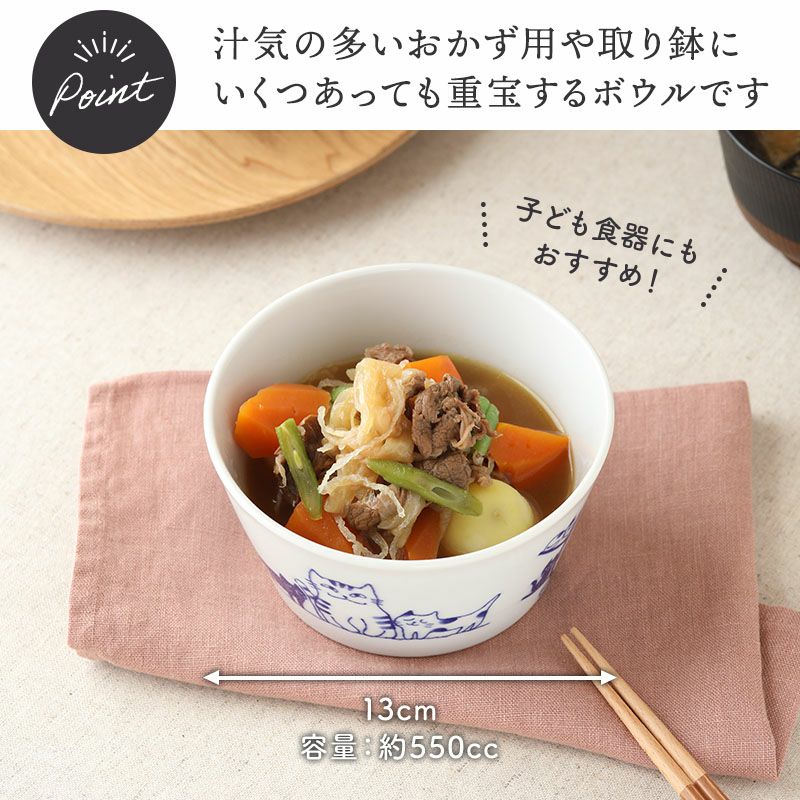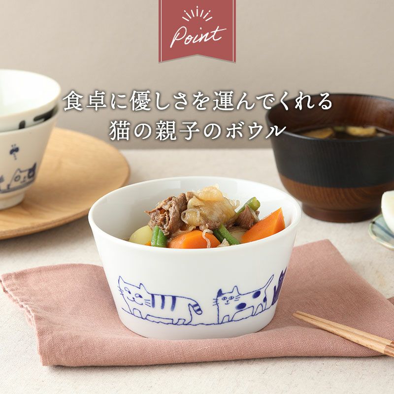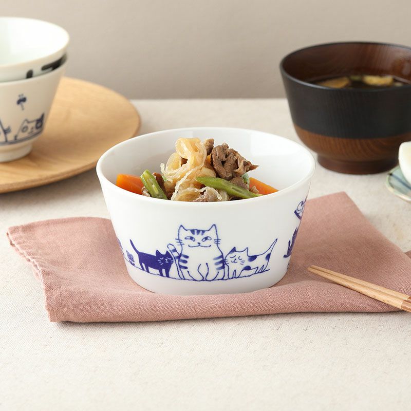 使う度にほっと癒される、猫の絵柄がかわいいボウル。 サラダボウル、スープボウル、シリアルボウル、ヨーグルトボウル、デザートボウルに最適。 大皿料理の取り鉢や、深さがあるのでお鍋料理のとんすい代わりや、具沢山のスープや汁気のあるおかずにも。 子ども用食器としても最適なサイズです。
