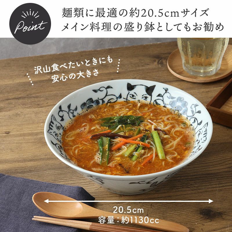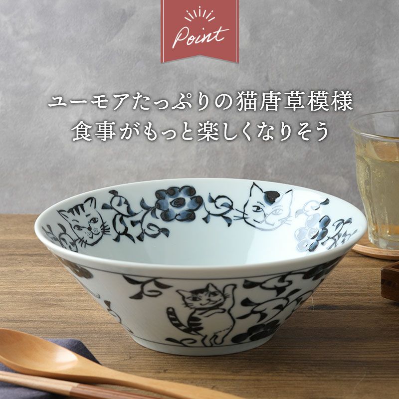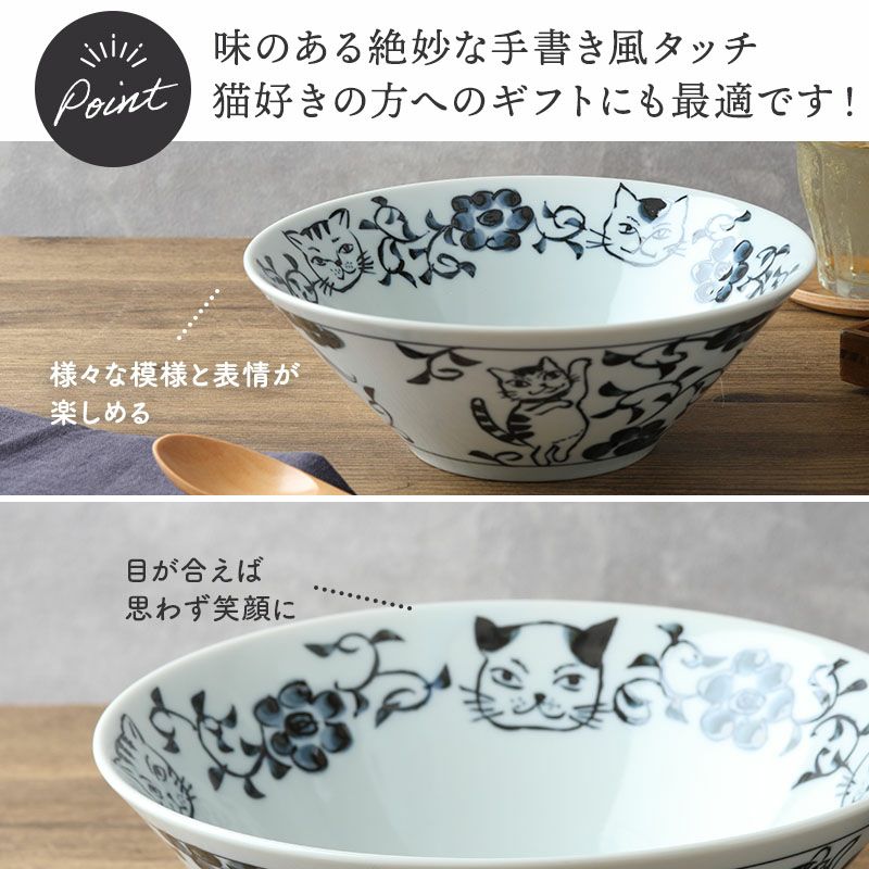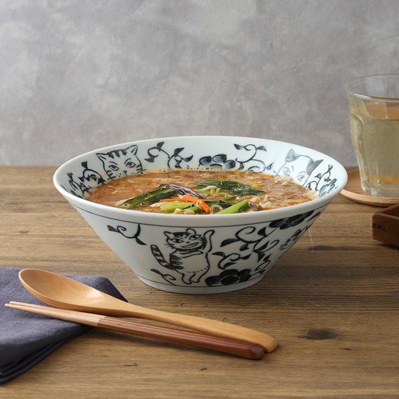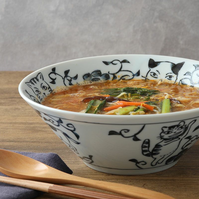 使う度にほっと癒される、猫の絵柄がかわいいラーメンどんぶり。 深さのある台形どんぶりで、ラーメンやうどんの麺類、丼ぶりものに最適。 大鉢や盛り鉢としても使えたり、具だくさんの料理、しっかり食べたい方にぴったりな丼ぶりです。 上品で使いやすい和食器なので、普段使いにはもちろん、おもてなし食器として取り入れてみてはいかがでしょうか。