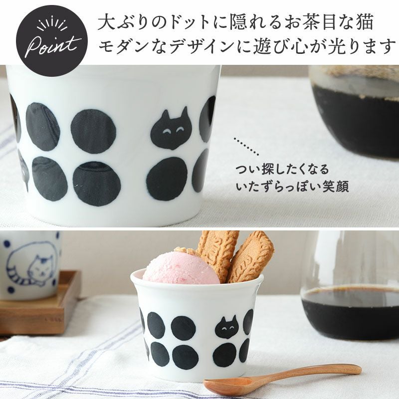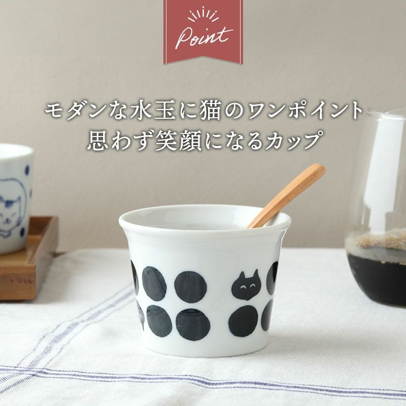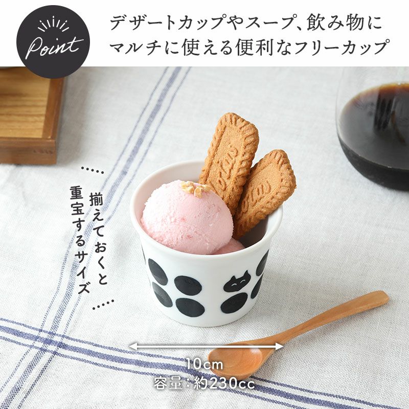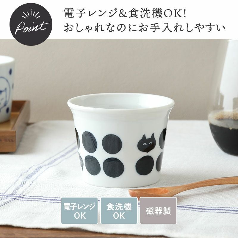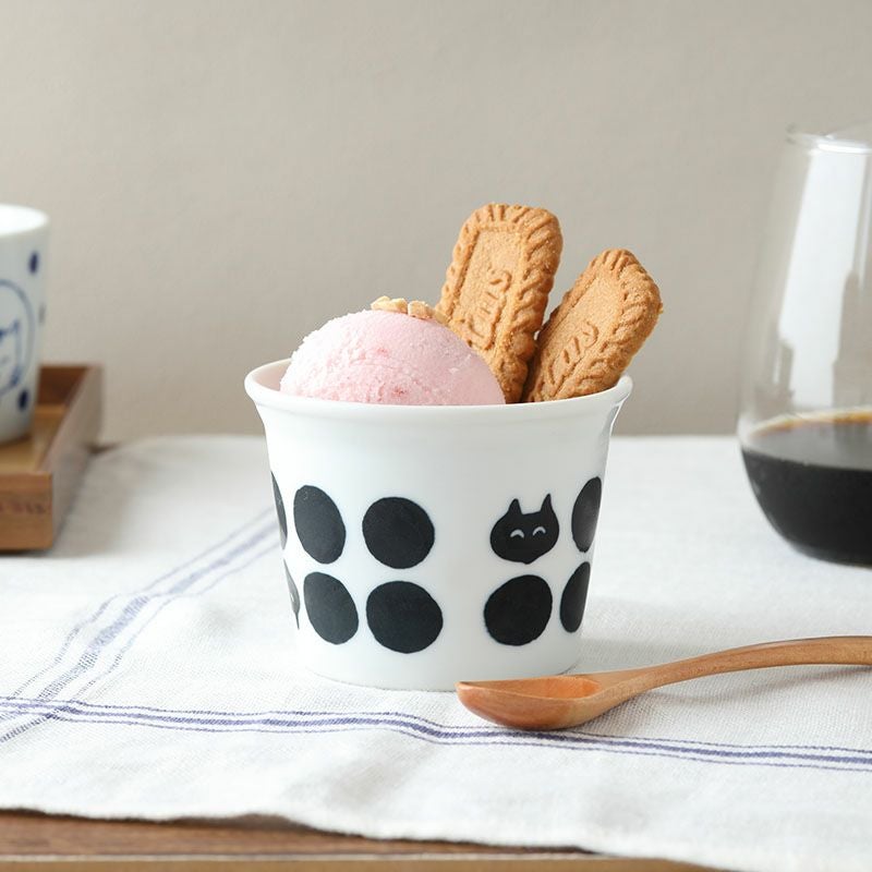 使う度にほっと癒される、猫の絵柄がかわいいマルチカップ 。 コーヒーカップなどのドリンクカップとして、デザートカップ、小鉢など、毎日使う器として重宝します。 満水で約230cc程なので、インスタントスープにも最適なサイズ。スープカップとして、いつもの朝食やランチにプラスワンしやすいですね。 アイスクリームにフルーツなどを添えて、デザートカップとしても素敵。プリンやゼリーなど、手作りスイーツを作る時にも使えます。いくつか揃えておくととても便利な食器です。
