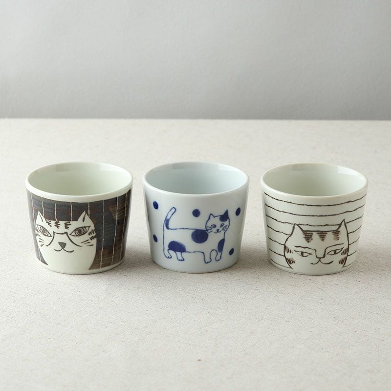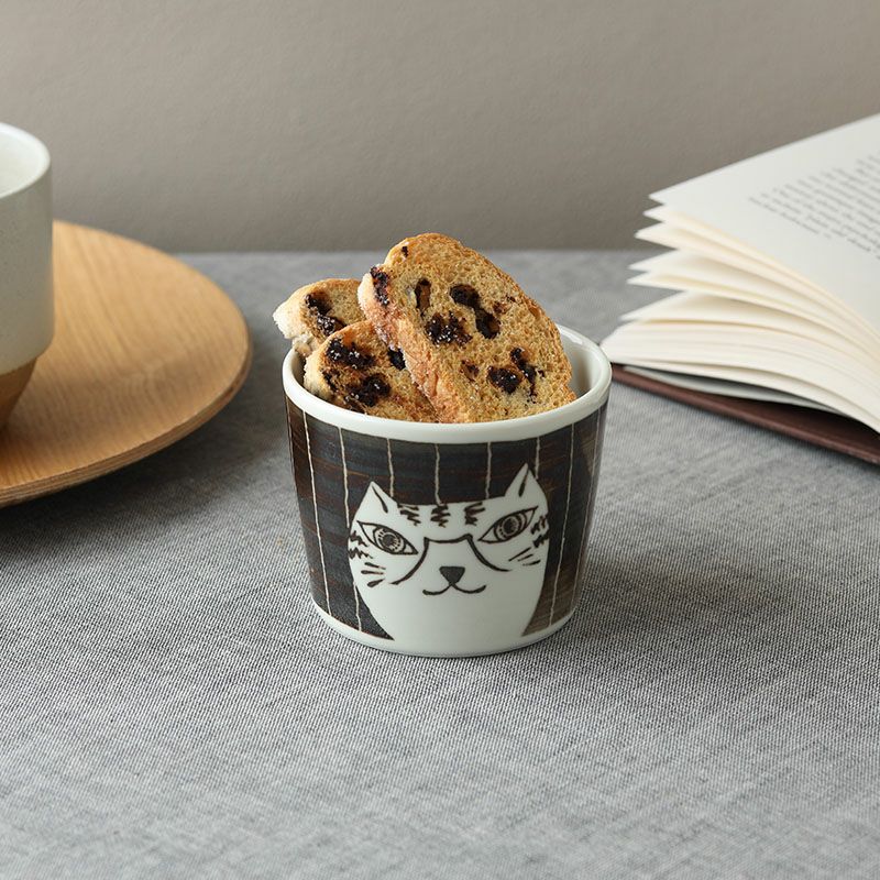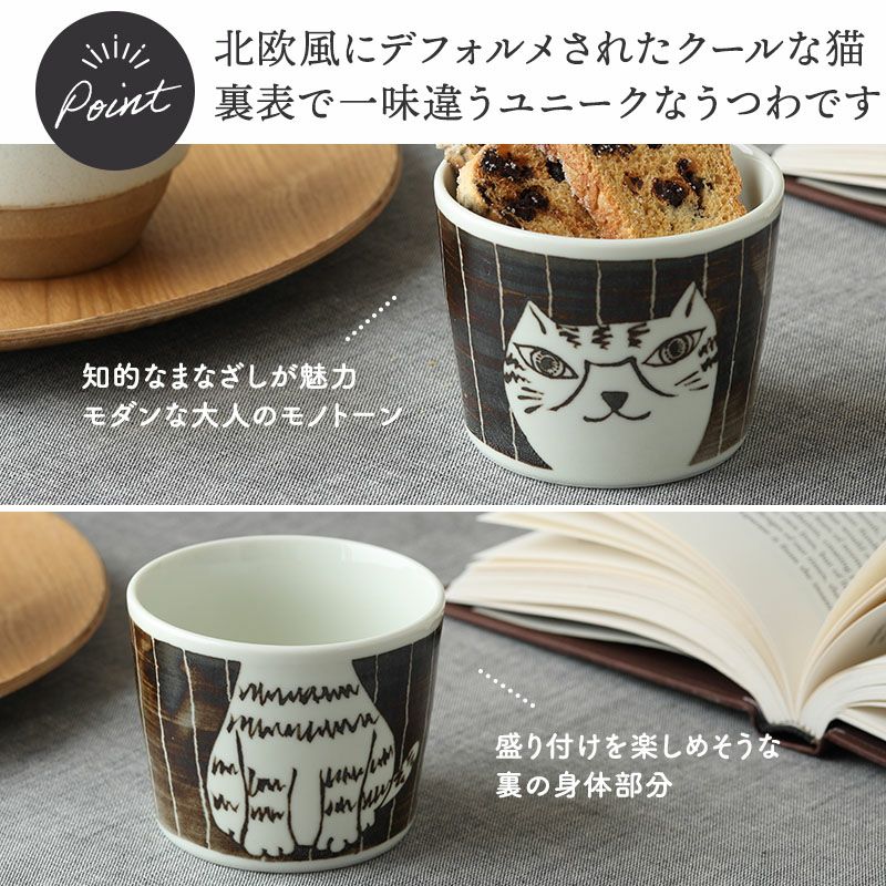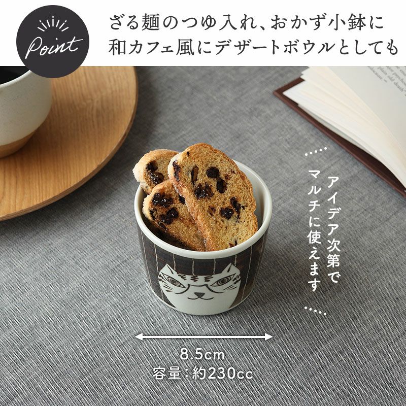 使う度にほっと癒される、猫の絵柄が印象的なそば猪口。 ざるそばやざるうどん、つけ麺などのつゆ入れとしてはもちろん、茶碗蒸し、小鉢などにもぴったりのサイズ感。 他にもプリンカップ、アイスカップ、サラダカップ、デザートカップなど、幅広い用途でお使いいただけます。 同シリーズで揃えると、より統一感のある華やかな食卓に。
