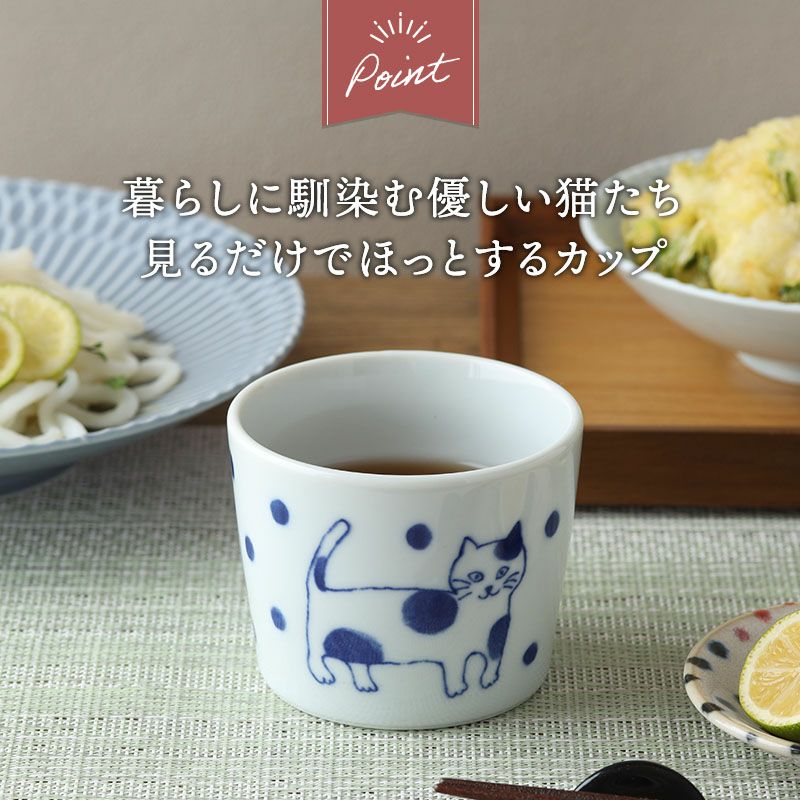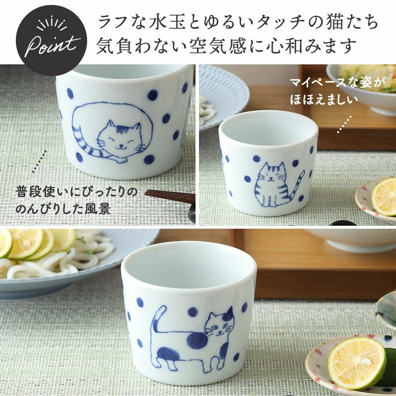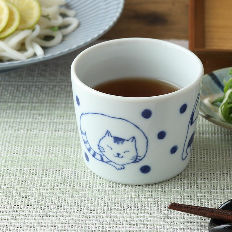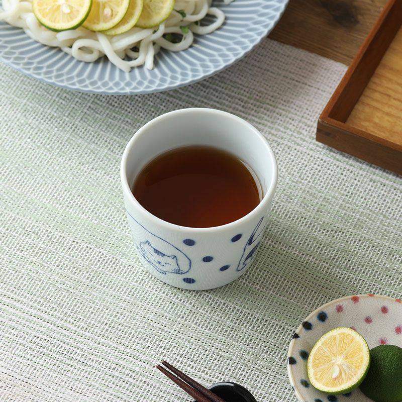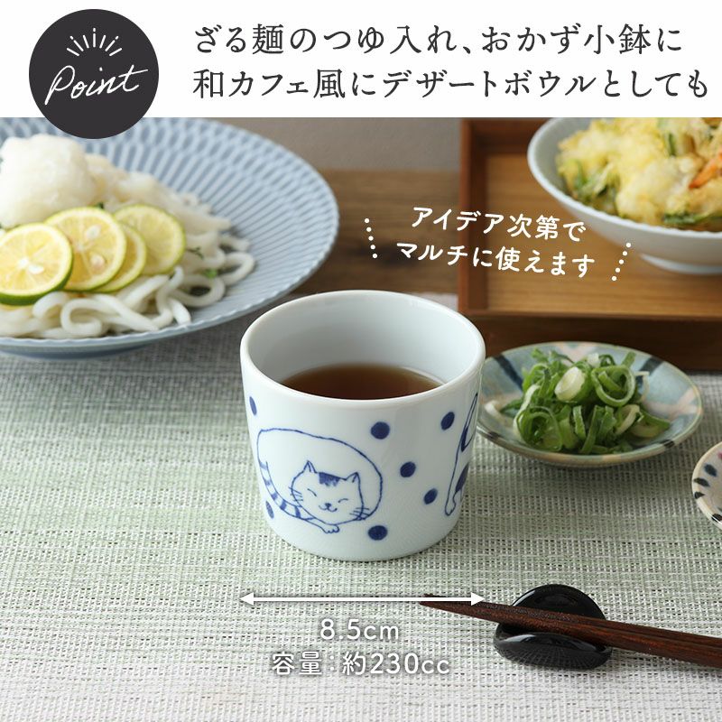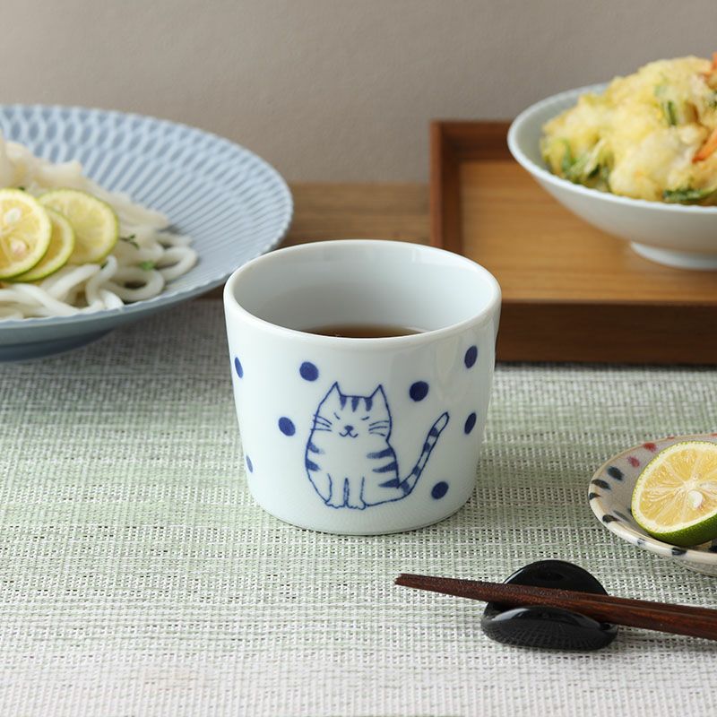 使う度にほっと癒される、爽やかな猫の絵柄がかわいいそば猪口。 ざるそばやざるうどん、つけ麺などのつゆ入れとしてはもちろん、茶碗蒸し、小鉢などにもぴったりのサイズ感。 他にもプリンカップ、アイスカップ、サラダカップ、デザートカップなど、幅広い用途でお使いいただけます。 同シリーズで揃えると、より統一感のある華やかな食卓に。