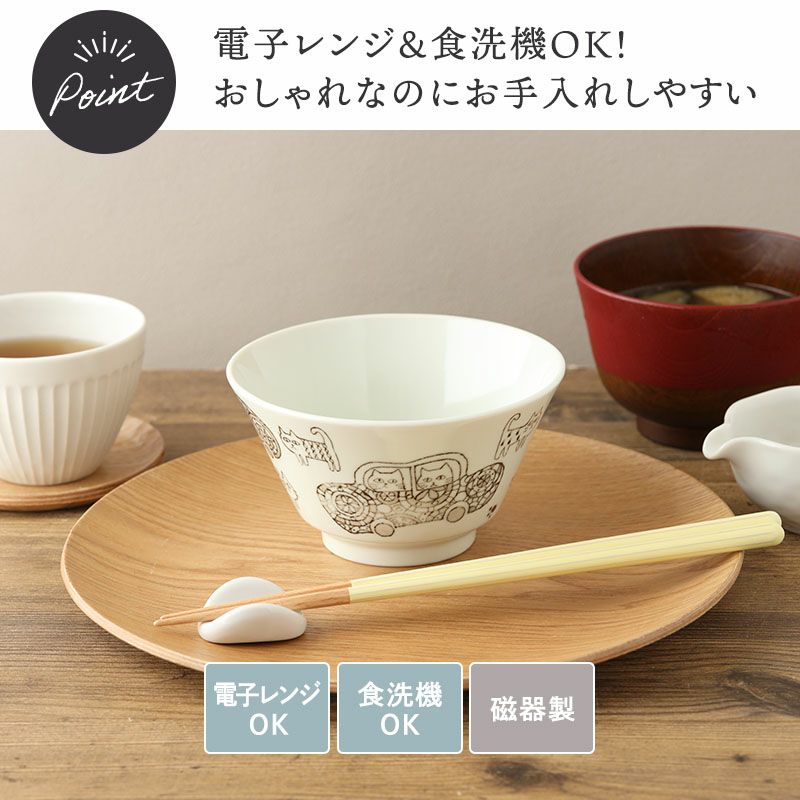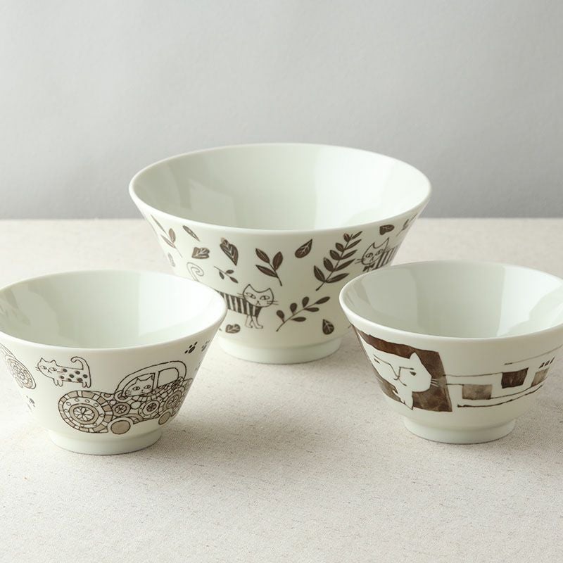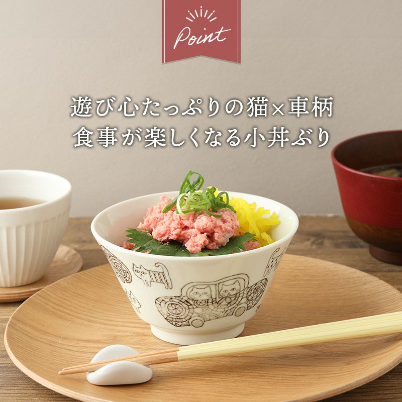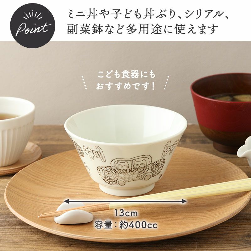 可愛らしいイラストがあしらわれた小さめどんぶり。 色味がシンプルで生活に馴染みやすく、使いやすい器です。 こちらのサイズはお子様用のミニうどん、ミニ丼に丁度いいサイズです。 小丼ぶり以外にもサラダボウル、シリアルボウル、スープボウル、副菜鉢など多用途にお使いいただけます。