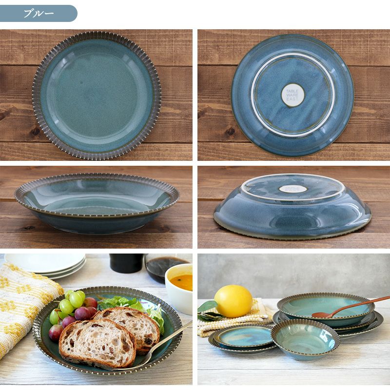 | 注意事項 | ※サイズは全て外寸になります。 ご注意 ※濃淡、釉薬の垂れ、鉄粉、ピンホール(針で突いたような小さな穴)が見られます。 ※焼成ごとに色味に個体差が見られる商品です。 ※ブルーは釉薬の性質上縁のストライプ部分もブルーの釉薬が入っております。 ※お客様のお使いのモニター設定、お部屋の照明等により実際の商品と色味が異なって見える場合がございます。 ※画像に含まれる小物は使用イメージのために使用しています。 |