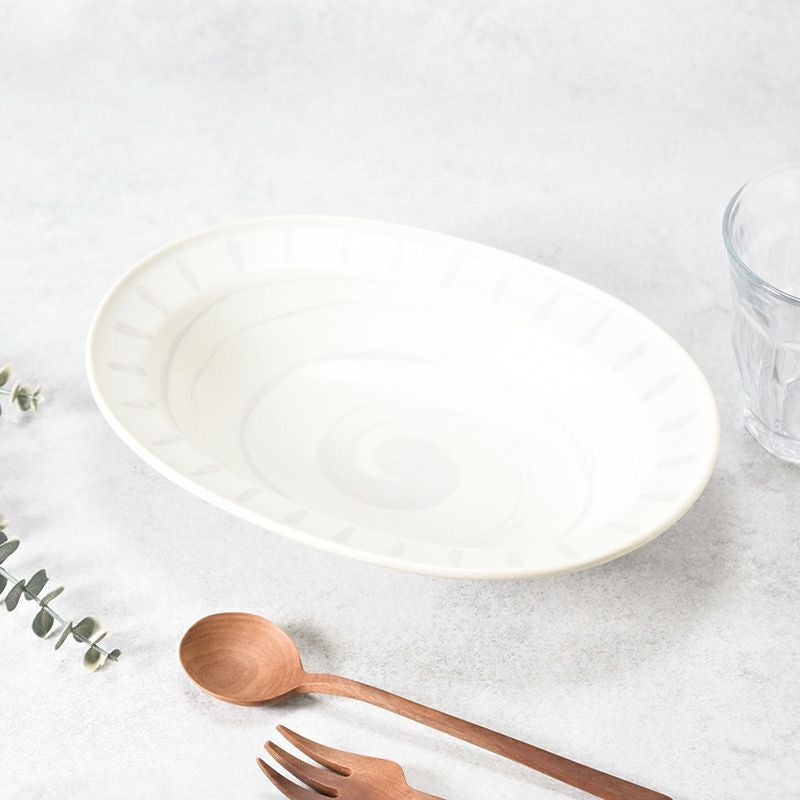 毎日使いたくなる、シンプルなリム付き楕円鉢です。 盛り皿やパスタ皿、デザート皿など様々な料理に使えます。 しっかり深さがあるのでスープやシチューのボウルとしても大活躍。 シンプルながらもテーブルで映える器です。