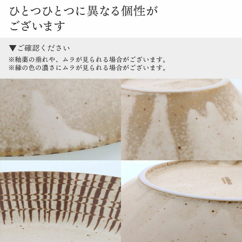 | 注意事項 | ※サイズは全て外寸になります。 ※サイズ・重さなどは商品により誤差があります。 ご注意 ※釉薬の垂れや、ムラが見られる場合がございます。 ※縁の色の濃さにムラが見られる場合がございます。 ※お客様のお使いのモニター設定、お部屋の照明等により実際の商品と色味が異なって見える場合がございます。 ※画像に含まれる小物は使用イメージのために使用しています。 ※不明な点がございましたら、お気軽にお問い合わせ下さい。 |