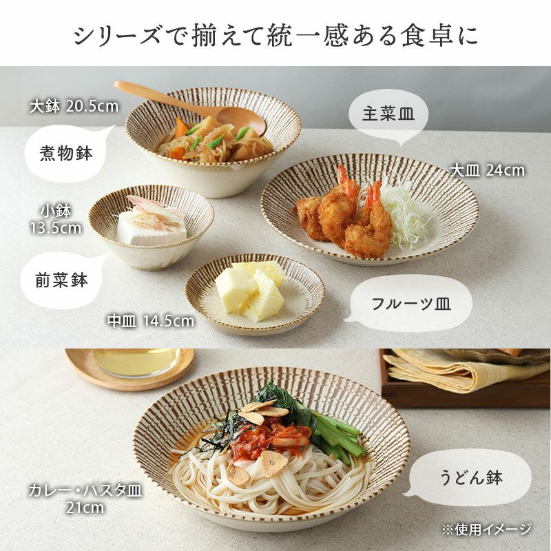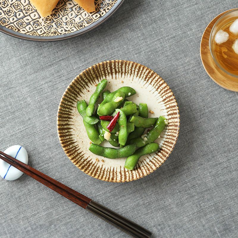 ベージュとブラウンの柔らかいコントラストが温かみのある印象の和食器です。 約14.3cmの中皿は取り皿やケーキ皿、サラダ皿、パン皿など多用途にお使いいただけます。 和カフェ風なアレンジも楽しめますよ。 また適度な立ち上がりがあるので、汁気のあるおかずにも最適です。