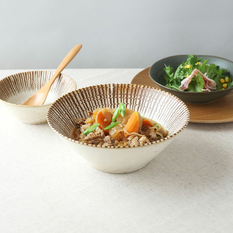 ベージュとブラウンの柔らかいコントラストが温かみのある印象の和食器です。 約20.5cmの大鉢は煮物鉢やサラダボウルなど、盛り鉢として大活躍! 和カフェ風なアレンジもできます。 容量もしっかりありますので、汁気のあるメニューなど、煮汁も一緒に楽しめますよ。