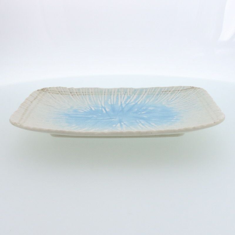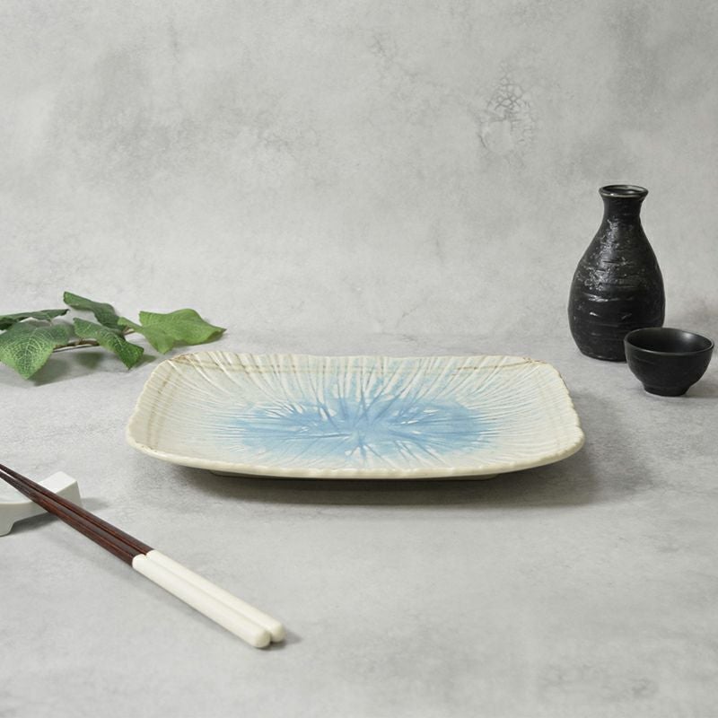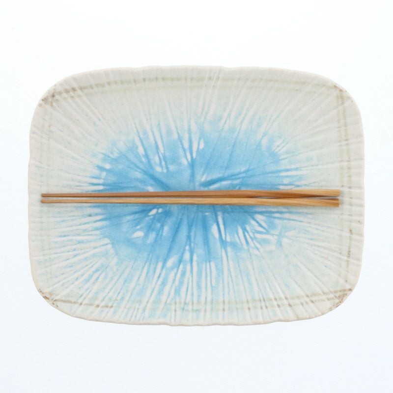 青の美しさが食卓を彩る、和食にぴったりの角皿。 こちらのサイズの角皿は焼物皿として定番のサイズ。 焼き魚皿、刺身皿、寿司皿はもちろん、たまご焼き、おかずの盛り皿にも最適です。 おもてなしにも、日常使いにもぴったりの一品です。