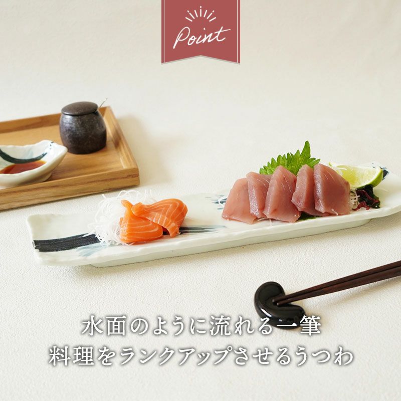 料理が映える、白と藍の上品な長皿です。 こちらの長皿はサンマ皿などに使えます。一尾まるごと乗って便利ですよ。 刺身皿や串物皿、おかずをちょこちょこ盛ってワンプレートとしてもオススメです。 日々の食卓にアートを取り入れられるような一皿です。