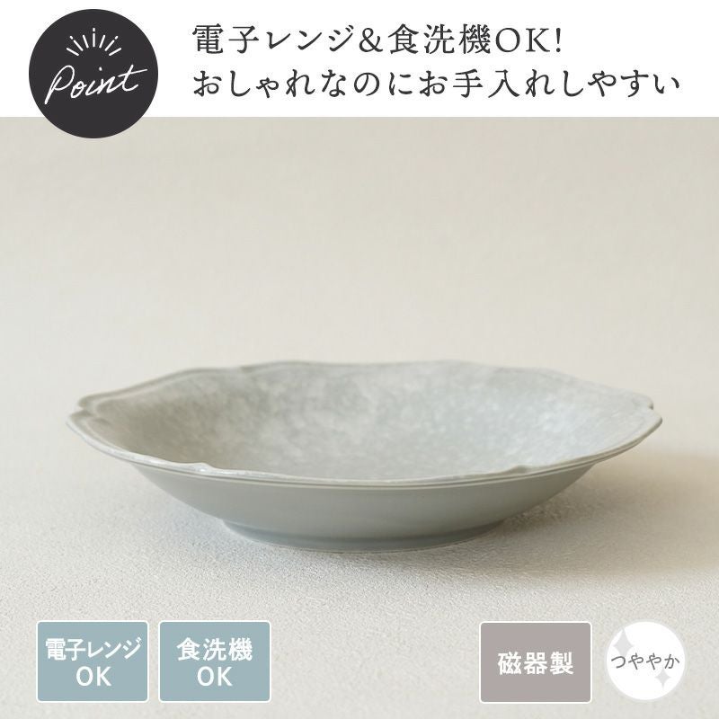 さりげない雪のような模様が施されたささめゆきシリーズの食器。 アンティークのような風合いでいつもの食卓をワンランクアップさせてくれる器です。 主菜皿、パスタ皿、カレー皿、おかずの盛り皿、サラダ皿などにもおすすめ。