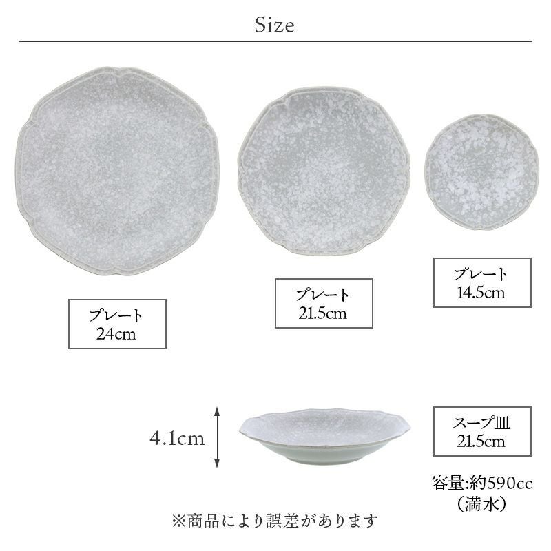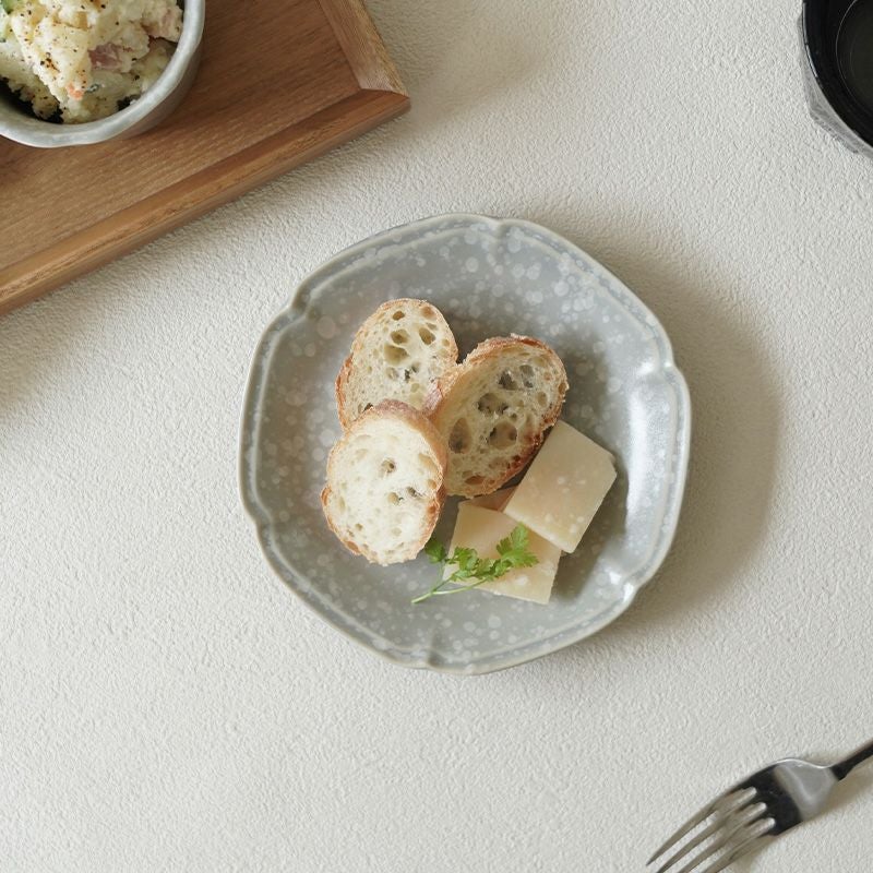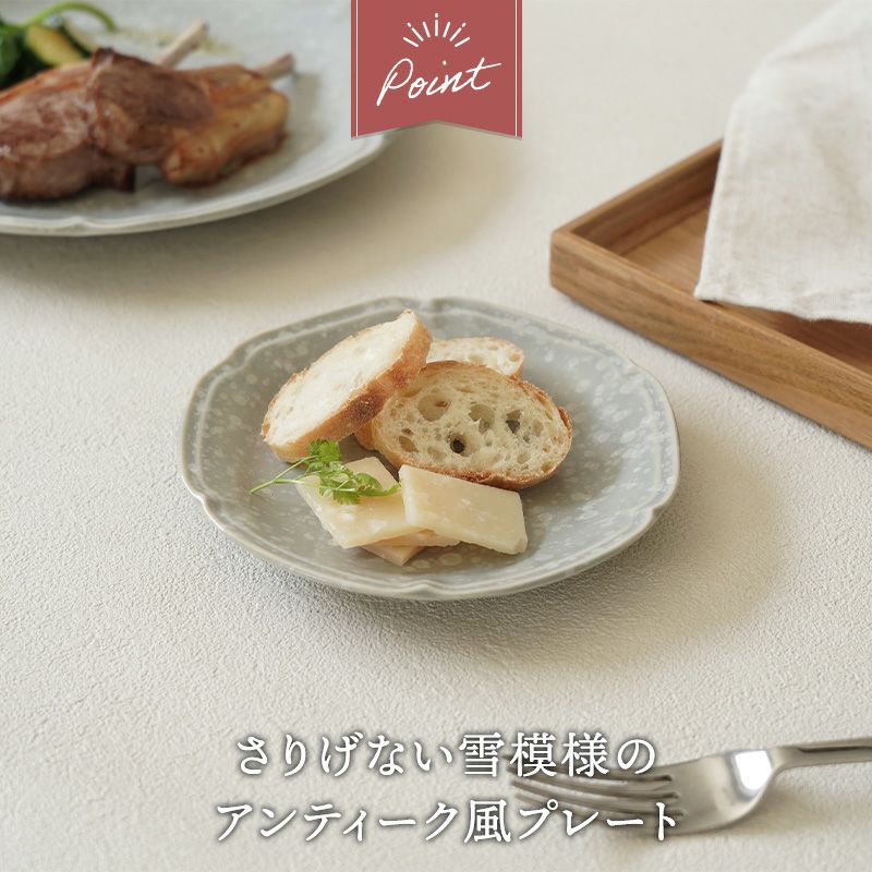 さりげない雪のような模様が施されたささめゆきシリーズの食器。 アンティークのような風合いでいつもの食卓をワンランクアップさせてくれる器です。 こちらは取り皿としてはもちろん、サラダ皿、パン皿、ケーキ皿、デザートプレートなど、多用途に使える便利なサイズのお皿です。 普段使いからおもてなし食器としてもお使いいただけます。