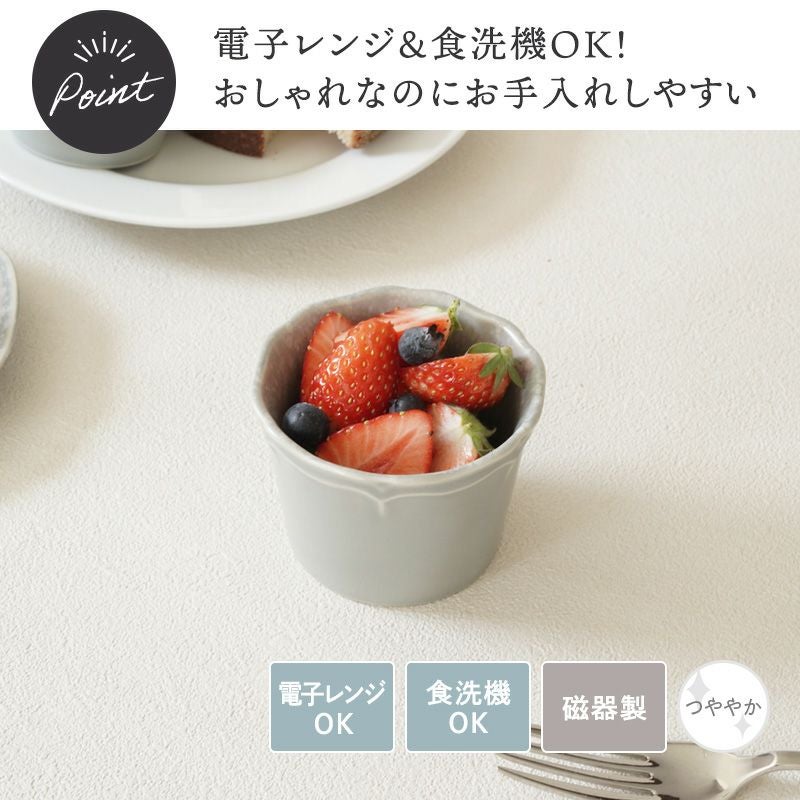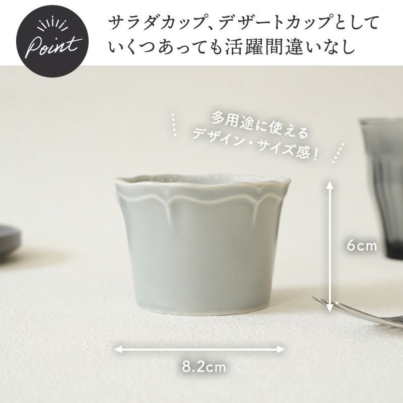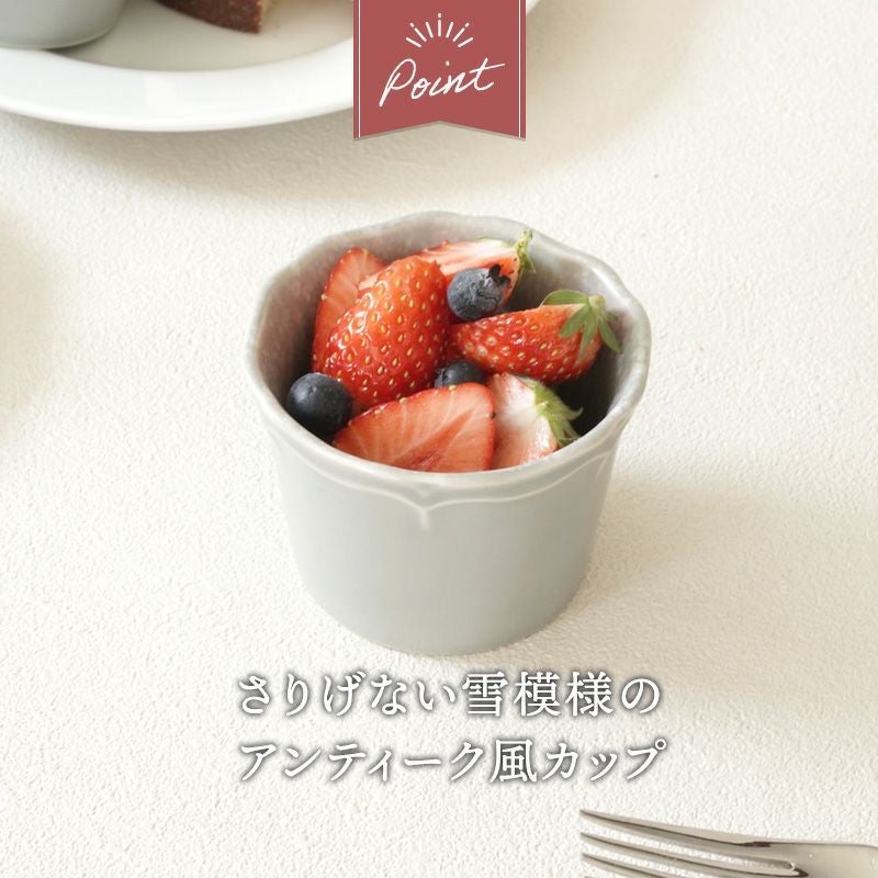 さりげない雪のような模様が施されたささめゆきシリーズの食器。 アンティークのような風合いでいつもの食卓をワンランクアップさせてくれる器です。 おかず小鉢やサラダカップ、茶碗蒸しやプリンなどのデザートカップとしてお使いいただけるサイズです。