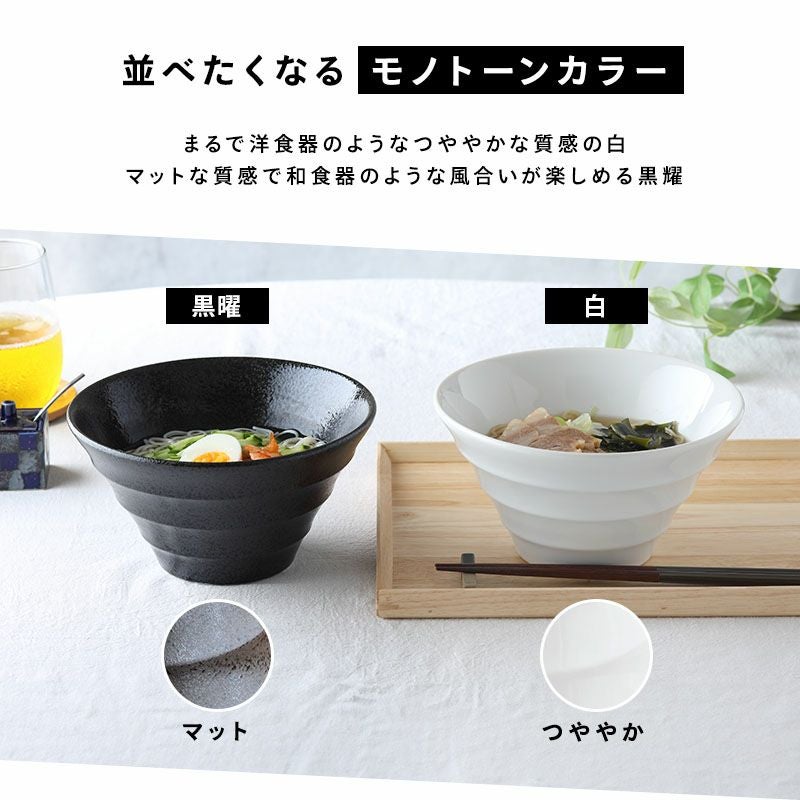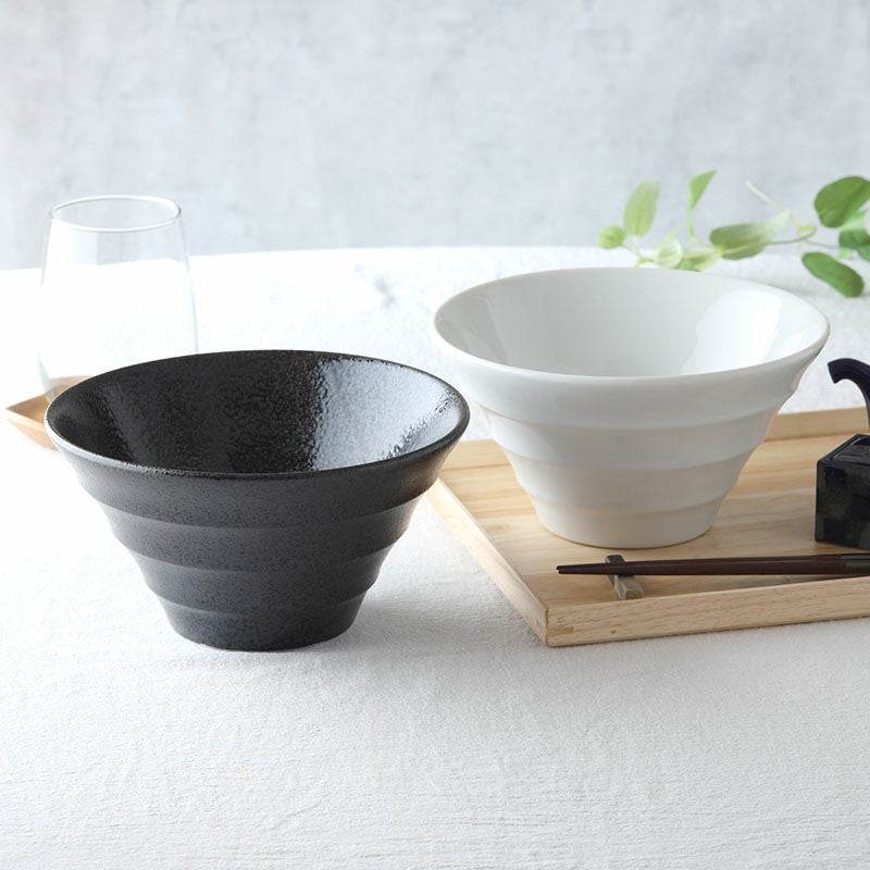 おしゃれな台形型のどんぶり19cmは、モダンな雰囲気。 つややかな「白」、マットな「黒耀」の2カラーで、和食器・洋食器どちらにも合わせやすいうつわです。 ボディは波打つようなボーダーデザイン。丼ぶり1つで高級感漂うテーブルコーディネート可能。 インスタントラーメンもこの丼ぶりに入れれば本格的に見せてくれます。 ラーメンなどの麺鉢としてはもちろん、カフェ丼、サラダボウルと、現代の食卓で使いやすい食器です。