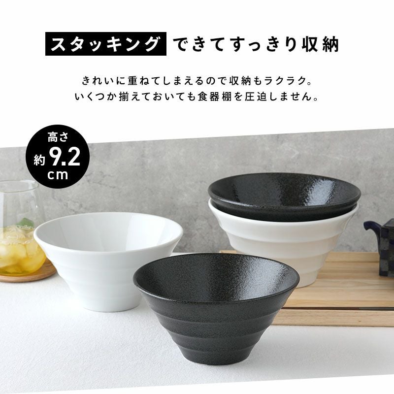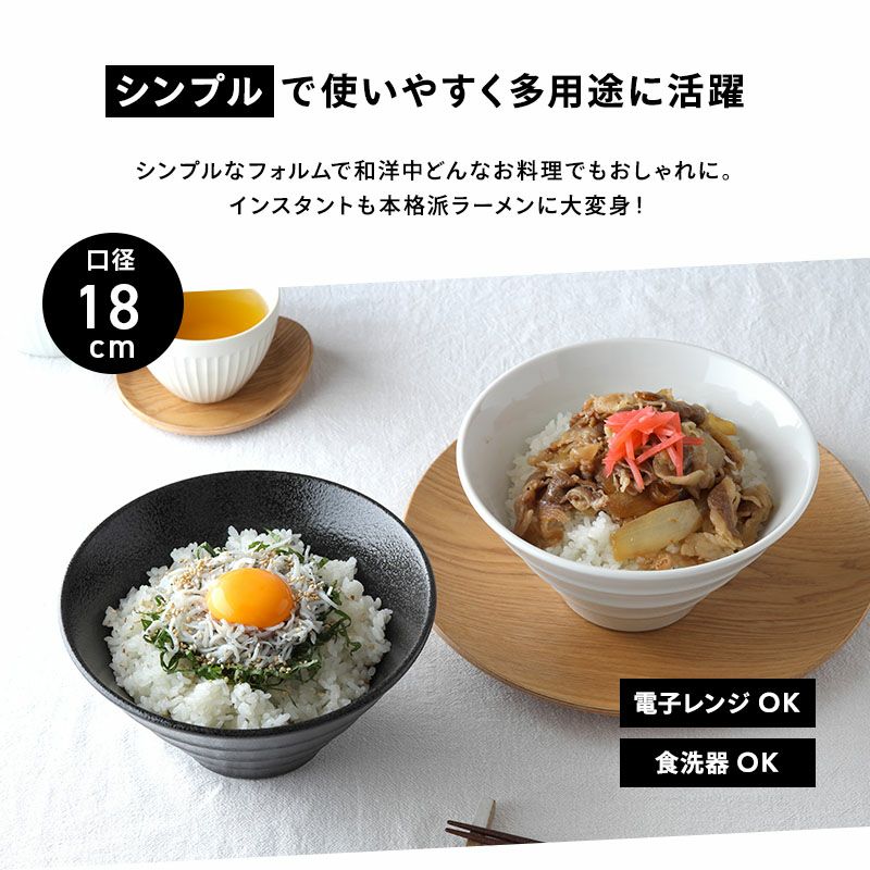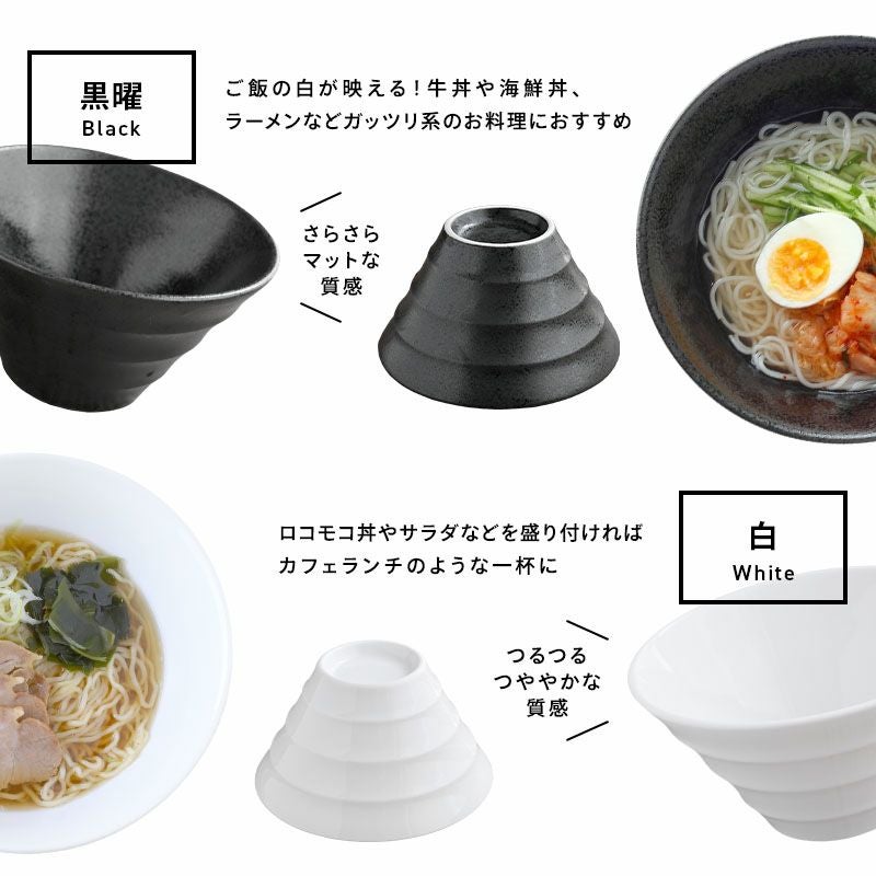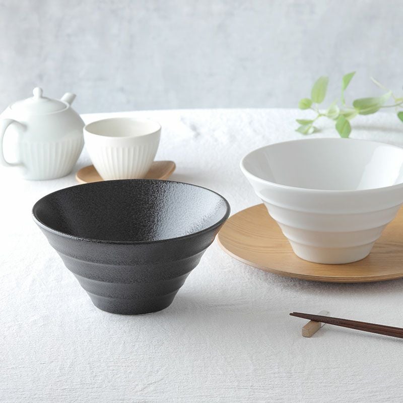 おしゃれな台形型のどんぶり18cmは、モダンな雰囲気。 つややかな「白」、マットな「黒耀」の2カラーで、和食器・洋食器どちらにも合わせやすいうつわです。 ボディは波打つようなボーダーデザイン。丼ぶり1つで高級感漂うテーブルコーディネート可能。 インスタントラーメンもこの丼ぶりに入れれば本格的に見せてくれます。 ラーメンなどの麺鉢としてはもちろん、カフェ丼、サラダボウルと、現代の食卓で使いやすい食器です。