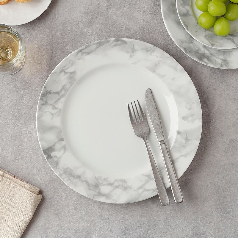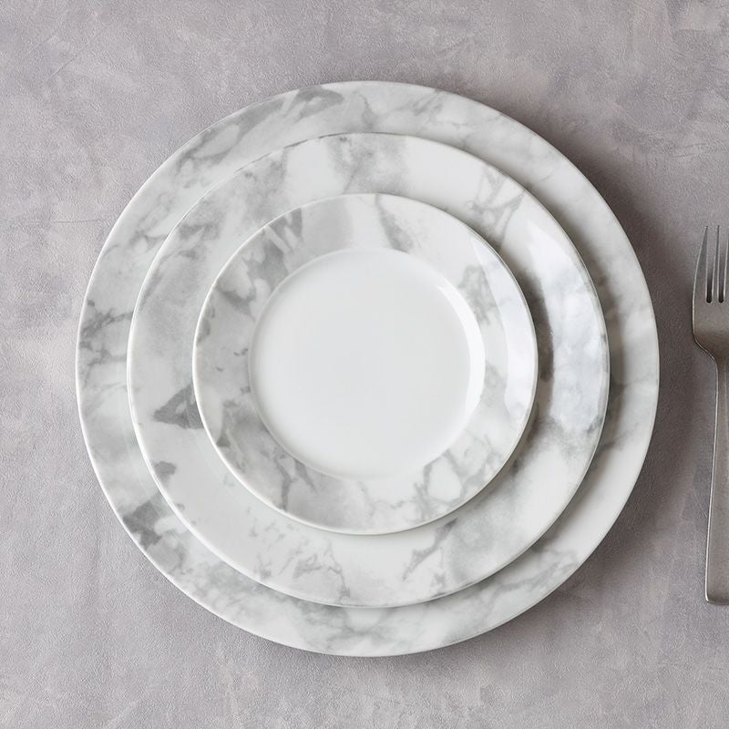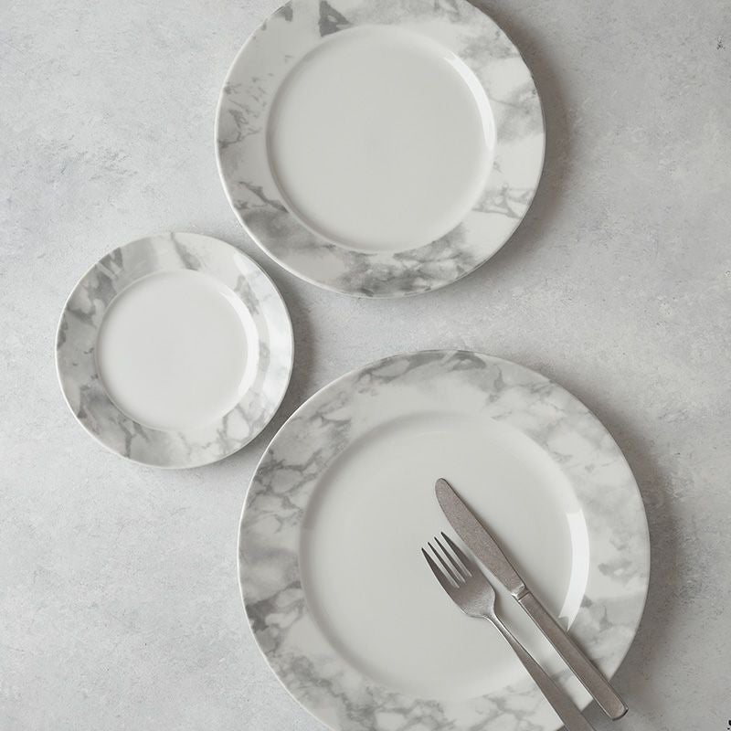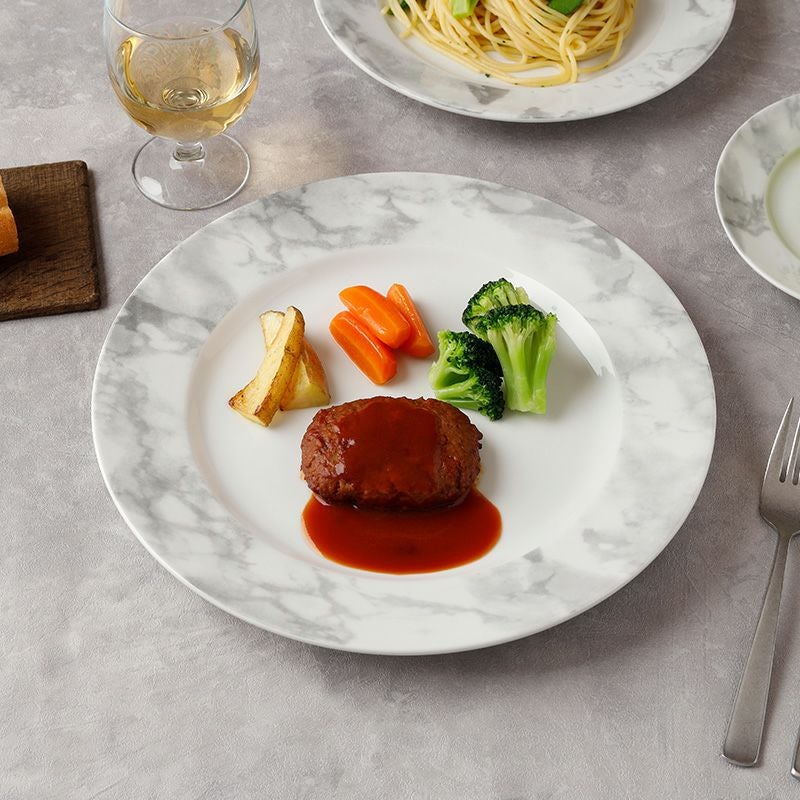 洗礼されたモダンなデザインの大理石調のプレート。 簡単に食卓をおしゃれに彩ってくれるので、上品なテーブルコーディネートにぴったりです。 メイン料理だけでなく、パーティー食器、ランチプレート、ディナープレートとして朝昼晩、幅広く使える食器。 28cmの大皿なので、ワンプレートでも余裕を持たせた盛り付けができますよ。