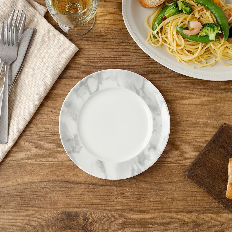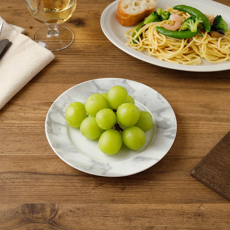 洗礼されたモダンなデザインの大理石調のプレート。 簡単に食卓をおしゃれに彩ってくれるので、上品なテーブルコーディネートにぴったりです。 取り皿はもちろん、サラダ皿、ケーキ皿、デザートプレートなど、様々なシーンで活躍します。 複数枚そろえておくと重宝するサイズのお皿です。