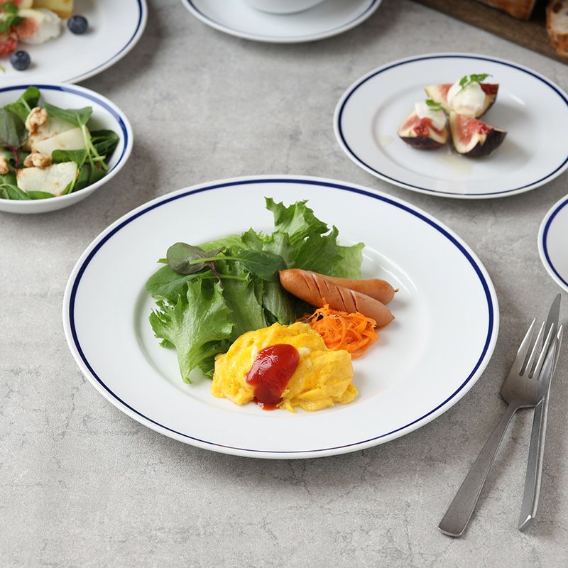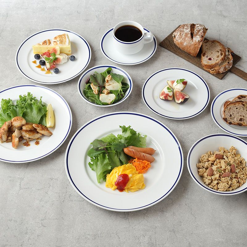 エレガントで高級感のある「インディゴライン」シリーズ。 上品なブルーラインとホワイトカラーは和食にも洋食にも合うので、使いやすいのが魅力的。 メイン料理だけでなくパーティー食器、ピザ皿、ランチプレート、ワンプレートとして朝昼晩、幅広く使える食器。 普段使いからおもてなし食器としても活躍しますよ。