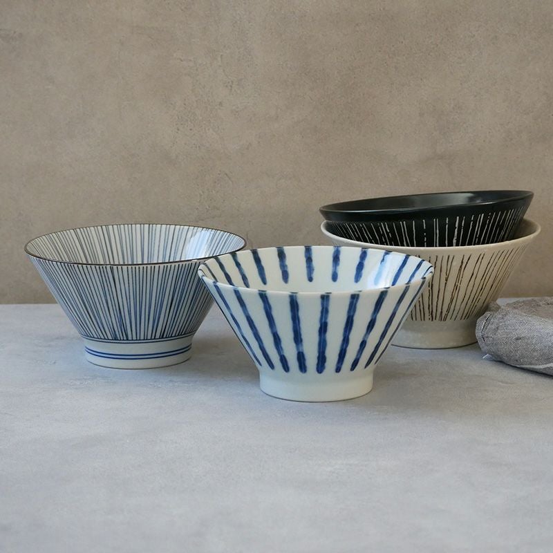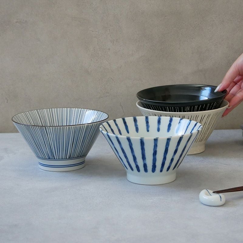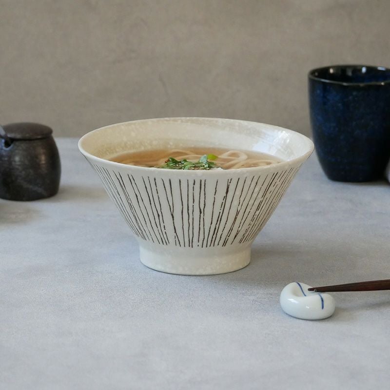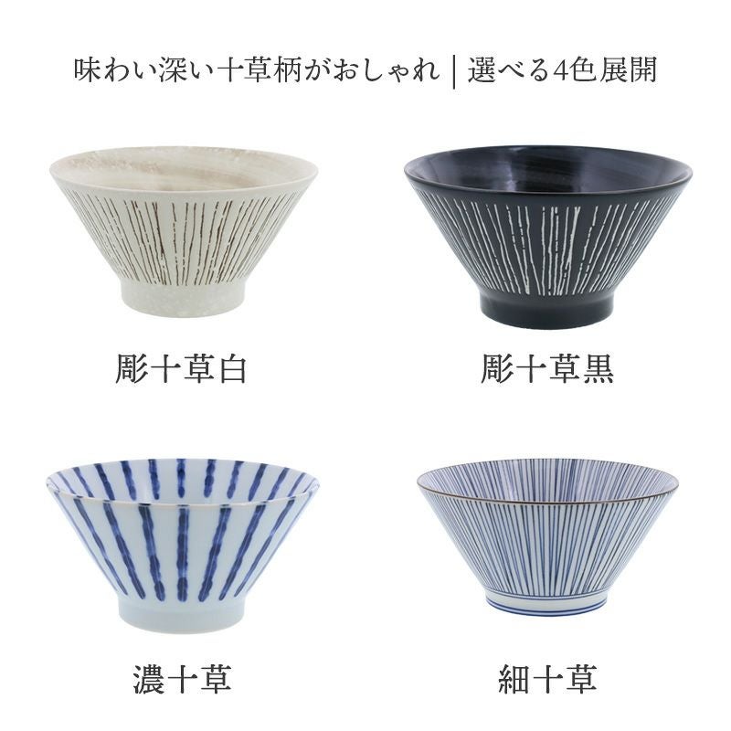 食卓によく馴染むモダンなデザインのおしゃれなどんぶり。 和食器の伝統柄、十草はどんな料理にも合わせやすく食材を華やかに見せてくれます。 こちらは深さのある台形どんぶりで、中鉢程の大きさですが意外とたっぷり入ります。 うどん丼ぶり、丼物メニューなどのどんぶりとしてはもちろん、具沢山のスープボウルにもオススメです。