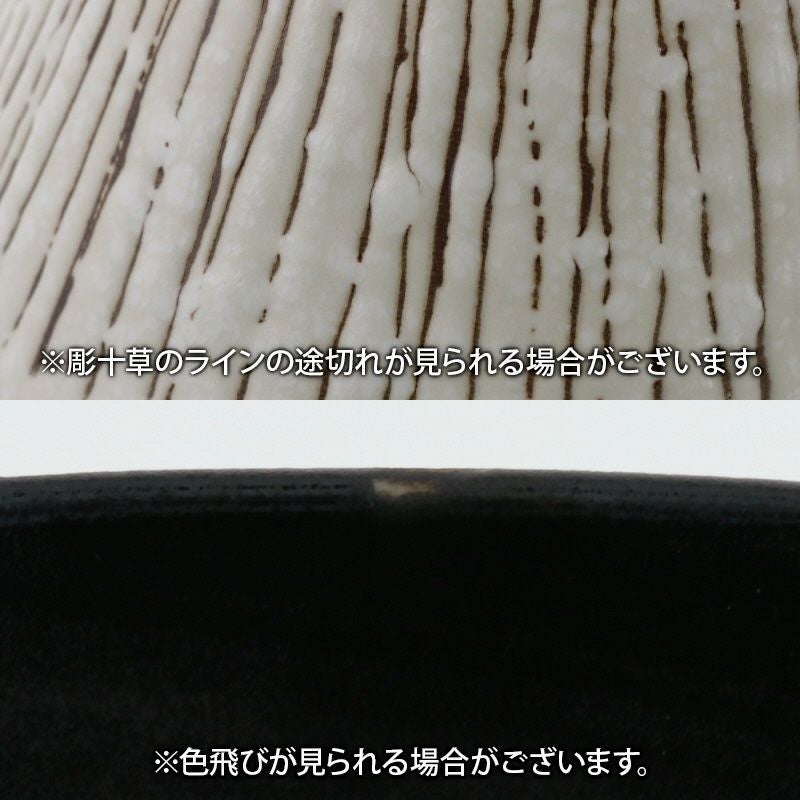 | 注意事項 | ※サイズは全て外寸になります。 ※サイズ・重さなどは商品により誤差があります。 ご注意 ※鉄粉やピンホール(小さな穴)、ボロ(小さな突起)が見られる場合がございます。 ※釉薬の垂れや溜まりやムラが見られる場合がございます。 ※彫十草のラインの途切れが見られる場合がございます。 ※色飛びが見られる場合がございます。 ※お客様のお使いのモニター設定、お部屋の照明等により実際の商品と色味が異なって見える場合がございます。 ※画像に含まれる小物は使用イメージのために使用しています。 ※不明な点がございましたら、お気軽にお問い合わせ下さい。 |