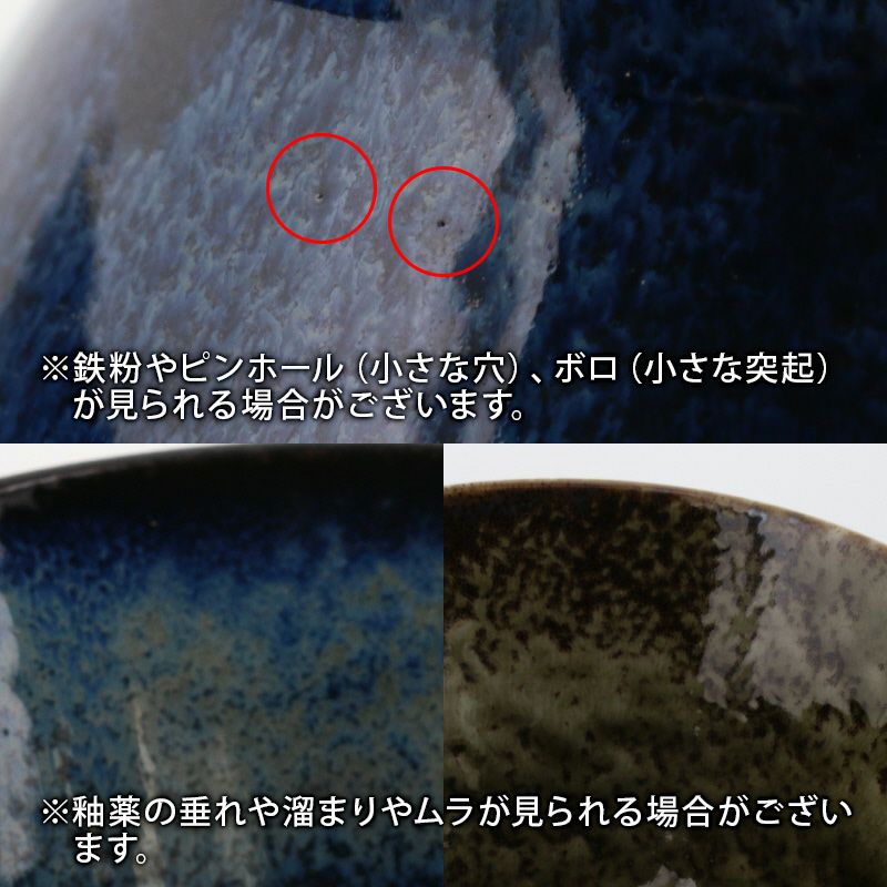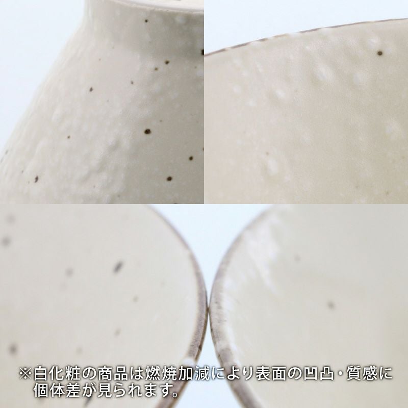 | 注意事項 | ※サイズは全て外寸になります。 ※サイズ・重さなどは商品により誤差があります。 ご注意 ※鉄粉やピンホール(小さな穴)、ボロ(小さな突起)が見られる場合がございます。 ※釉薬の垂れや溜まりやムラが見られる場合がございます。 ※白化粧の商品は燃焼加減により表面の凹凸・質感に個体差が見られます。 ※お客様のお使いのモニター設定、お部屋の照明等により実際の商品と色味が異なって見える場合がございます。 ※画像に含まれる小物は使用イメージのために使用しています。 ※不明な点がございましたら、お気軽にお問い合わせ下さい。 |
