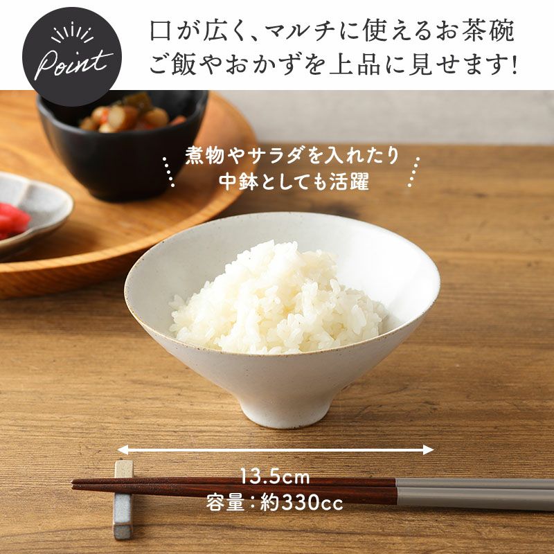 モダンなフォルムがおしゃれなお茶碗。 お子様や女性に程よいやや小ぶりなサイズ。 深さがある茶わんなのでご飯の量が調整しやすく、卵かけご飯や納豆ご飯を食べるのにも最適です。 サイズ違いで揃えて、夫婦茶碗にするのもおすすめですよ♪