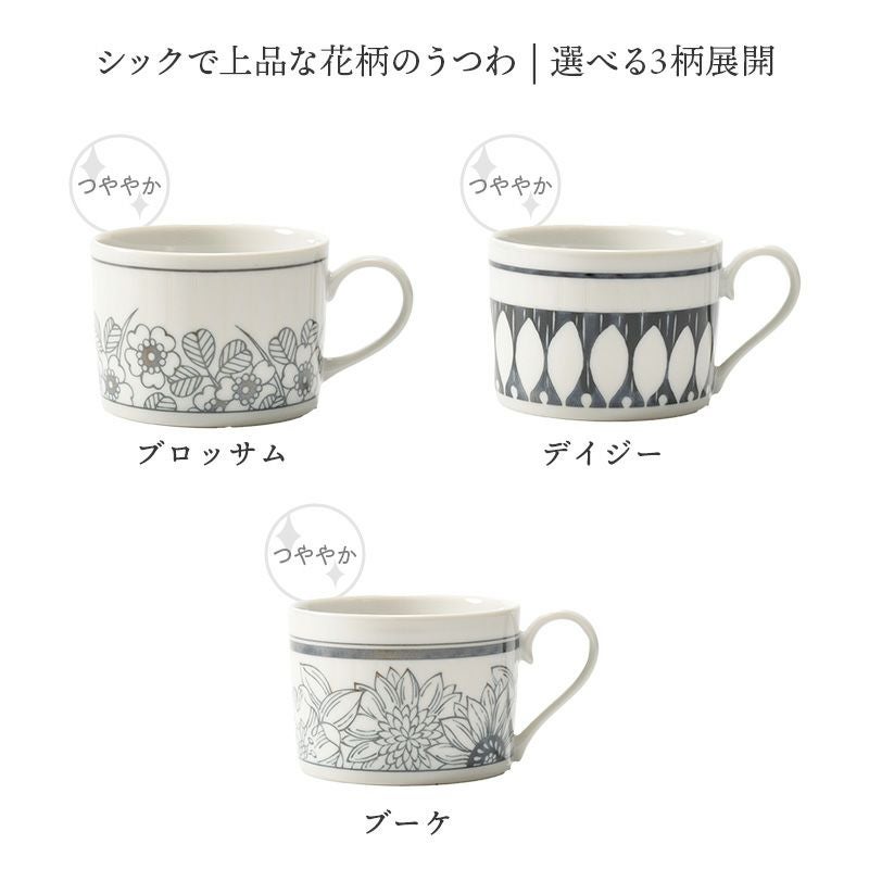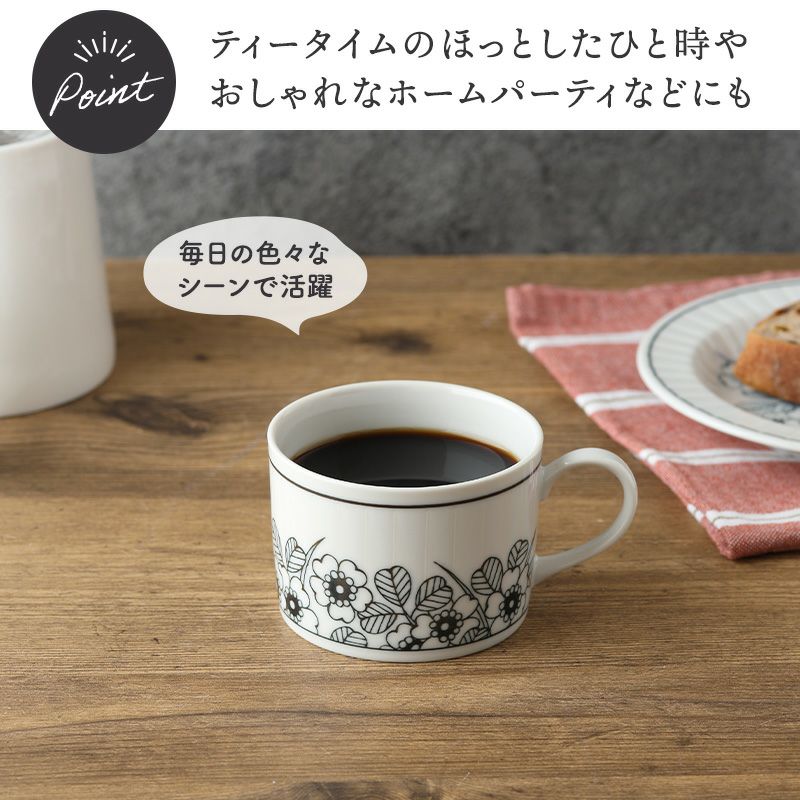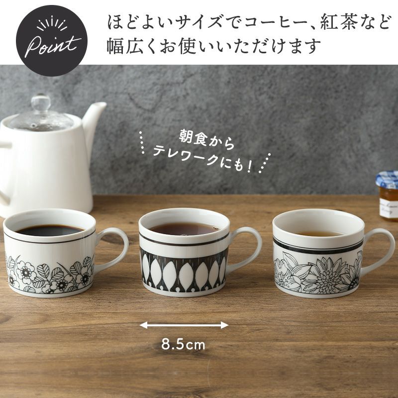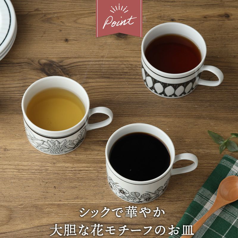 シックで上品な花柄がおしゃれなマグカップ。 落ち着きのある大人っぽいカラーです。 朝食のコーヒー、食後のお茶、カフェタイムに、仕事の合間に、来客時に…様々なシーンで使えます。 華やかなデザインで、カフェ風にも楽しめますよ♪