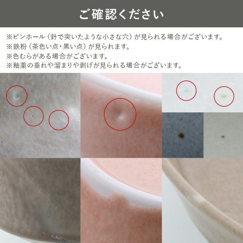 | 注意事項 | ※サイズは全て外寸になります。 ご注意 ※形状の変更に伴い在庫が切り替わるまでの間どちらかの形のお届けとなります。形状のご指定はできませんのでご了承ください。 ※色むら・ピンホール(針で突いたような小さな穴)・鉄粉(茶色い点・黒い点)・釉薬の垂れや溜まりや剥げが見られる場合がございます。 ※コットンホワイトの色味は、商品毎にヒビのような模様、貫入(かんにゅう)が入る場合がございます。 ※お客様のお使いのモニター設定、お部屋の照明等により実際の商品と色味が異なって見える場合がございます。 ※画像に含まれる小物は使用イメージのために使用しています。 |