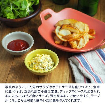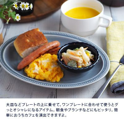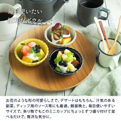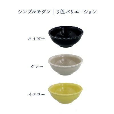 縁のフリルがビスケットのようにも見えるかわいいボウル。 北欧カラーのグレー、ネイビー、イエローで大人っぽい雰囲気でシックな器にも合わせやすいデザイン。 小鉢、副菜鉢、前菜鉢としてや、、ヨーグルトボウル、デザートボウルなど幅広い用途にお使いいただける大きさです。 大皿にのせてカフェ風ワンプレートを楽しむこともできます。