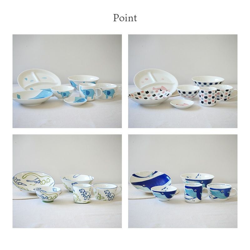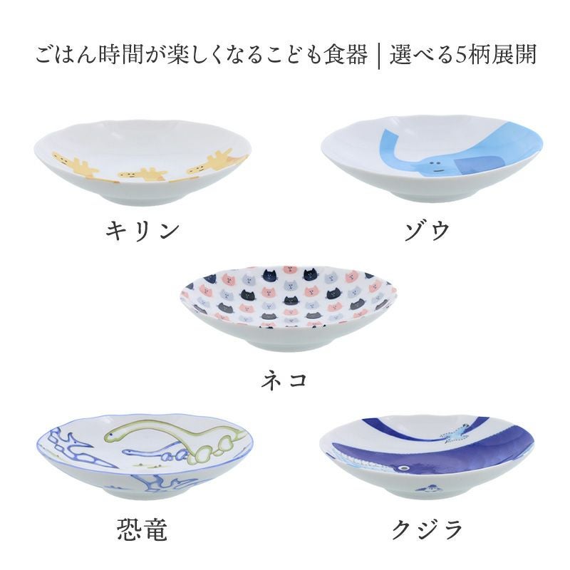 ごはん時間が楽しくなるかわいいこども食器です♪ 柄はキリン・ゾウ・ネコ・恐竜・クジラの5種類。ちょこんと描かれたユニークなお顔や、手書き風のデザインが魅力的。 こちらの楕円皿はパスタ皿やカレー皿、おかずの盛り皿、深さがあるので煮物鉢として汁物もしっかりと盛り付けることができます。 お子さまの好みに合わせてお気に入りの柄をお選びください♪