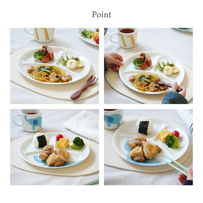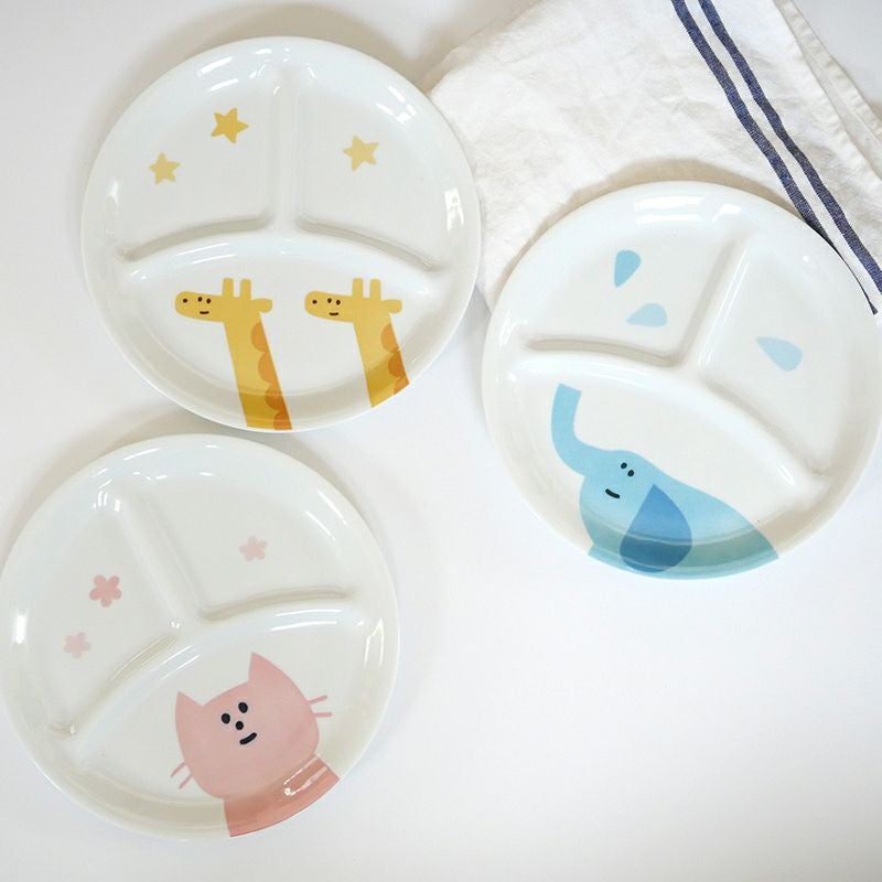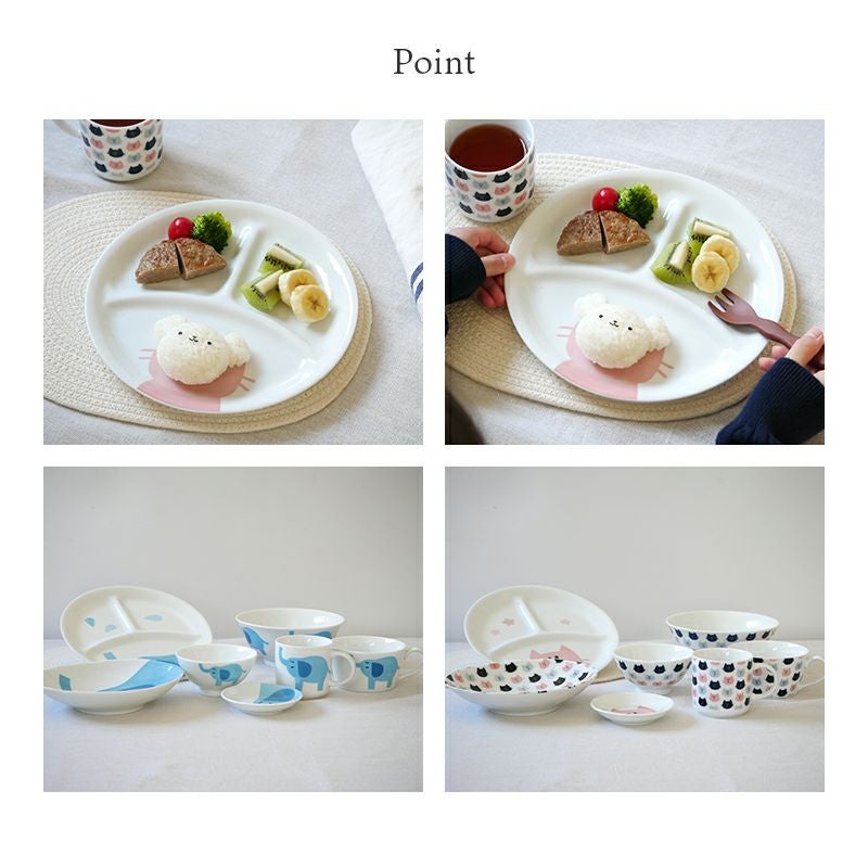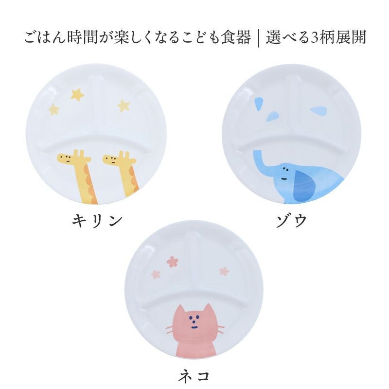 ごはん時間が楽しくなるかわいいこども食器です♪ 柄はキリン・ゾウ・ネコの3種類。ちょこんと描かれたユニークなお顔や、手書き風のデザインが魅力的。 1枚のお皿に複数のおかずやサラダ、フルーツを盛り付けることができる便利なワンプレートです。 お子さまの好みに合わせてお気に入りの柄をお選びください♪