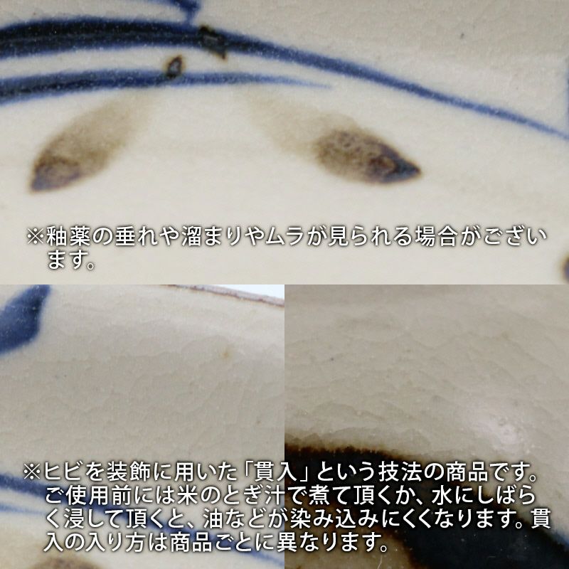 | 注意事項 | ※サイズは全て外寸になります。 ※サイズ・重さなどは商品により誤差があります。 ご注意 ※鉄粉やピンホール(小さな穴)、ボロ(小さな突起)が見られる場合がございます。 ※柄むらがある場合がございます。 ※釉薬の垂れや溜まりやムラが見られる場合がございます。 ※ヒビを装飾に用いた「貫入」という技法の商品です。ご使用前には米のとぎ汁で煮て頂くか、水にしばらく浸して頂くと、油などが染み込みにくくなります。貫入の入り方には商品ごとに異なります。 ※お客様のお使いのモニター設定、お部屋の照明等により実際の商品と色味が異なって見える場合がございます。 ※画像に含まれる小物は使用イメージのために使用しています。 ※不明な点がございましたら、お気軽にお問い合わせ下さい。 |