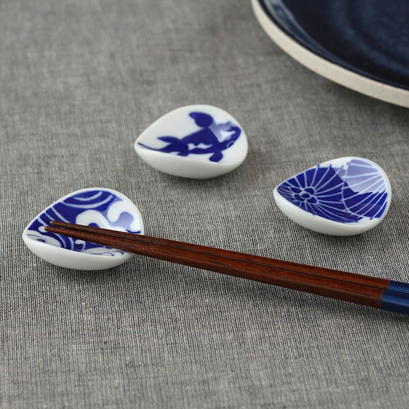 和の趣を感じられる絵柄の箸置き。 落ち着いた色味のブルーはテーブルのアクセントになりますね。 頑張って作ったご飯をちょっと特別にしたいときに箸置きはオススメ! 普段使いはもちろん、来客時のおもてなし用にもお使いいただけますよ。