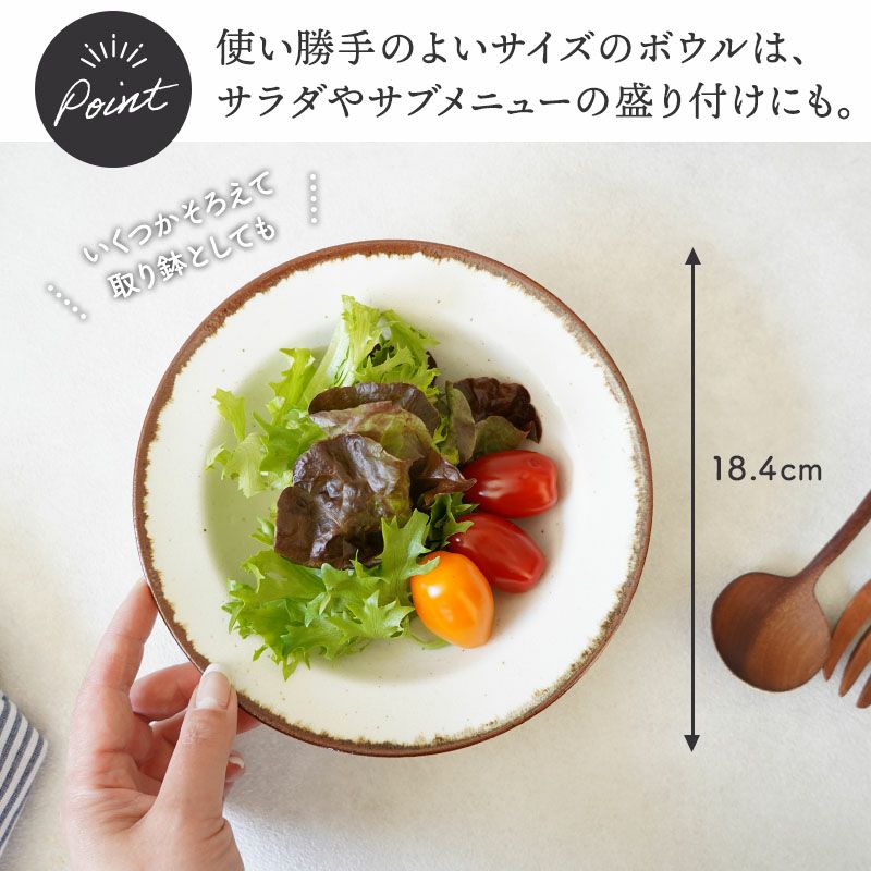 シンプルなデザインが使いやすい、おしゃれな中鉢。 こちらの中鉢はサラダボウルや、おかずの盛り鉢・煮物鉢など汁気のあるおかずの器にぴったり。 その他シチューボウルや、シリアルボウルなどにも使えます。優しい色合いで、和・洋・中に合わせやすく、同じシリーズのプレートと合わせてコーディネートも楽しめますよ。 食洗機・レンジも使用可能で、普段使いからパーティ食器、おもてなしまで、様々なシーンで活躍してくれる万能食器です。