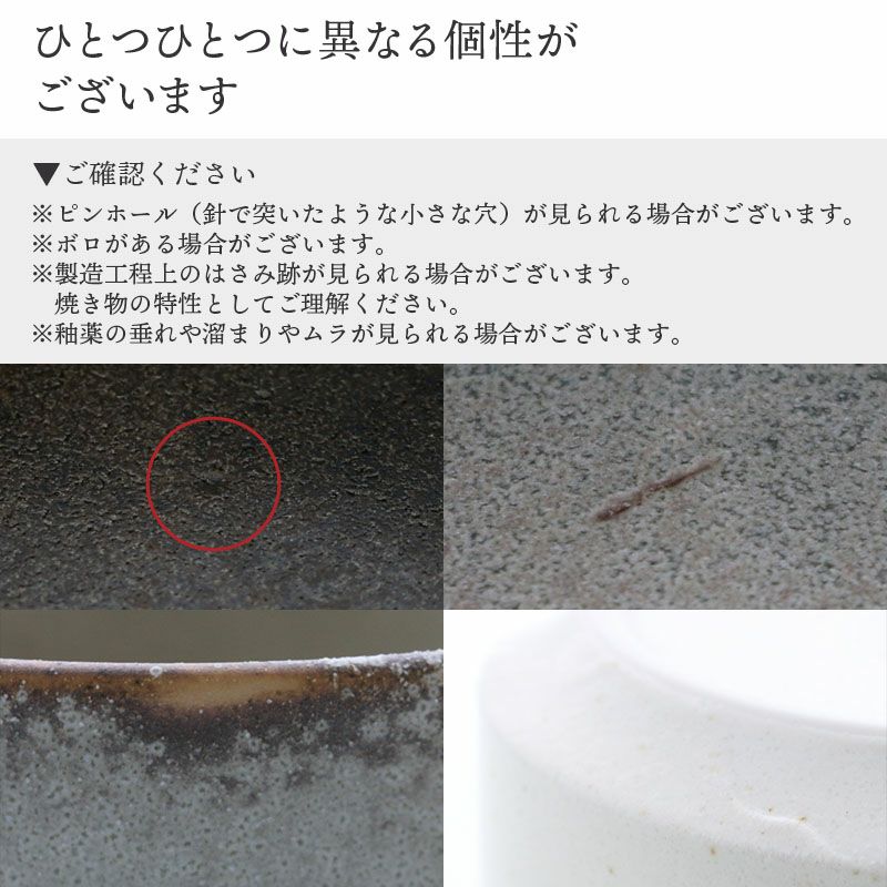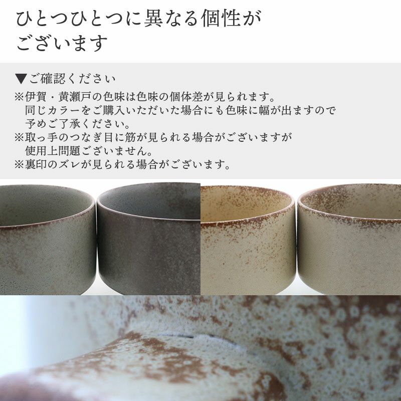 | 注意事項 | ※サイズは全て外寸になります。 ※サイズ・重さなどは商品により誤差があります。 ご注意 ※伊賀・黄瀬戸の色味は色味の個体差が見られます。同じカラーをご購入いただいた場合にも色味に幅が出ますので予めご了承ください。 ※取っ手のつなぎ目に筋、ピンホール(針で突いたような小さな穴)、裏印のズレなどが見られる場合がございます。 ※ボロ、釉薬の垂れや溜まりやムラ、製造工程上のはさみ跡などが見られる場合がございます。焼き物の特性としてご理解ください。 ※お客様のお使いのモニター設定、お部屋の照明等により実際の商品と色味が異なって見える場合がございます。 ※画像に含まれる小物は使用イメージのために使用しています。 ※不明な点がございましたら、お気軽にお問い合わせ下さい。 |
