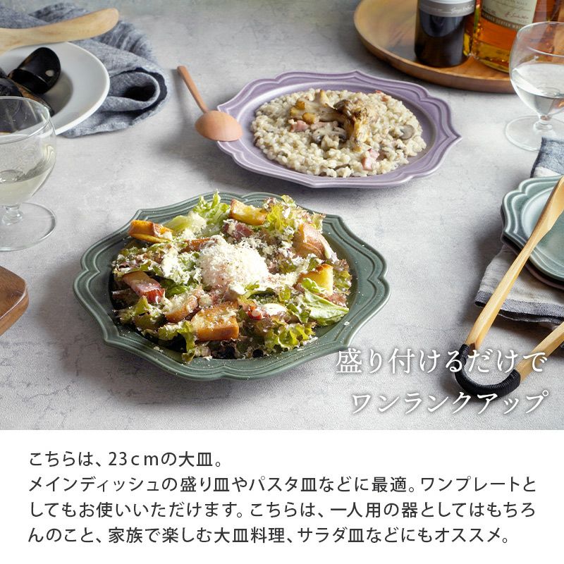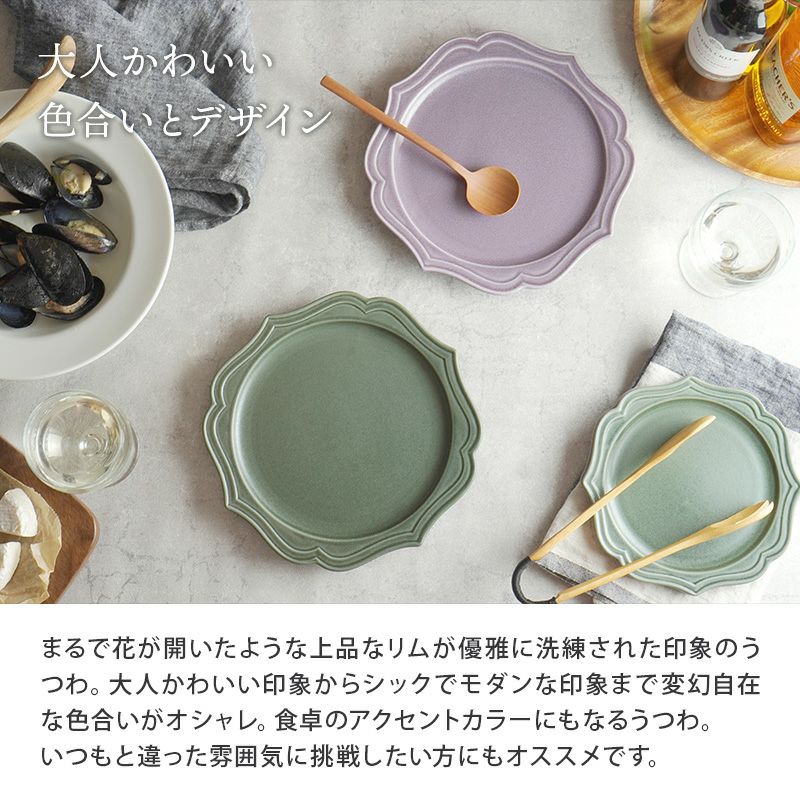 | セット内容 | リムが花びらのような印象で美しい表情を見せるラフィネシリーズ。ニュアンスカラーがオシャレで落ち着いた上品な空間を演出してくれます。★簡単に盛り付けるだけでワンランクアップしてくれるアイテム。おもてなしの際にもお使いいただけます。・電子レンジ・食洗機可 オーブン・直火不可・質感/つややか・素材/陶器★ご注意;※全体的に釉薬の垂れ跡、濃淡、ムラ、ピンホールがに見られます。 入荷毎に色味が異なる場合がございます。※裏印のズレが見られる場合がございます。※お客様のお使いのモニター設定、お部屋の照明等により実際の商品と色味が異なって見える場合がございます。 |