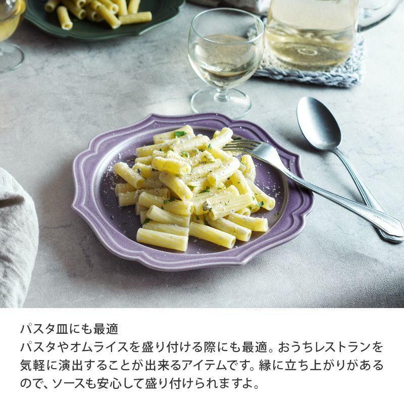 西洋の食器をイメージした丸皿は縁の装飾が料理やテーブルに高級感を演出してくれます。 シックなカラーなので、和食にも馴染んでくる洋食器。 うつわの縁からチラリと見える白土が清潔感ある印象。 こちらは23cmの大皿サイズです。パスタ皿、ディナープレート、ワンプレートなどにぴったり。 サラダやおかずの盛り皿としてもおすすめです。 普段使いはもちろん、おもてなし食器としても最適。